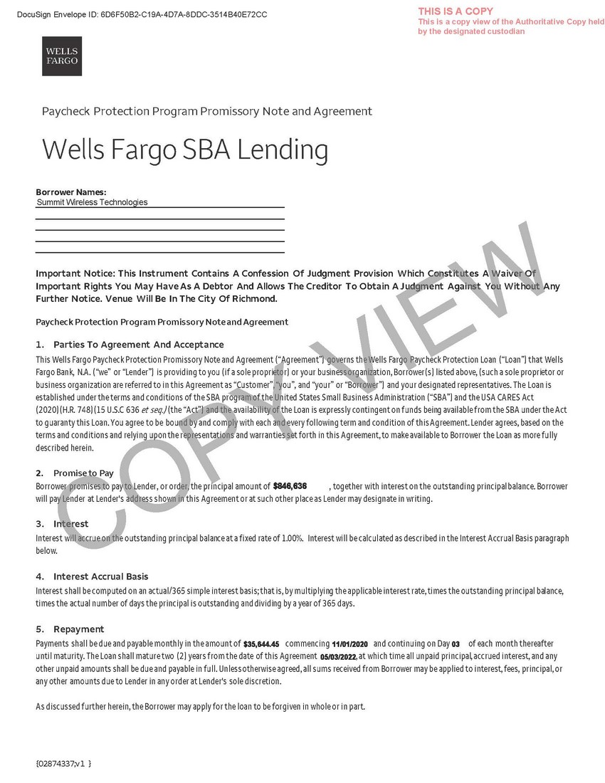 {02874337;v1 } Paycheck Protection Program Promissory Note and Agreement Wells Fargo SBA Lending Borrower Names: Important Notice: This Instrument Contains A Confession Of Judgment Provision Which Constitutes A Waiver Of Important Rights You May Have As A Debtor And Allows The Creditor To Obtain A Judgment Against You Without Any Further Notice. Venue Will Be In The City Of Richmond. Paycheck Protection Program Promissory Note and Agreement 1. Parties To Agreement And Acceptance This Wells Fargo Paycheck Protection Promissory Note and Agreement (“Agreement”) governs the Wells Fargo Paycheck Protection Loan (“Loan”) that Wells Fargo Bank, N.A. (“we” or “Lender”) is providing to you (if a sole proprietor) or your business organization, Borrower(s) listed above, (such a sole proprietor or business organization are referred to in this Agreement as “Customer”, “you”, and “your” or “Borrower”) and your designated representatives. The Loan is established under the terms and conditions of the SBA program of the United States Small Business Administration (“SBA”) and the USA CARES Act (2020)(H.R. 748)(15 U.S.C 636 et seq.) (the “Act”) and the availability of the Loan is expressly contingent on funds being available from the SBA under the Act to guaranty this Loan. You agree to be bound by and comply with each and every following term and condition of this Agreement. Lender agrees, based on the terms and conditions and relying upon the representations and warranties set forth in this Agreement, to make available to Borrower the Loan as more fully described herein. 2. Promise to Pay Borrower promises to pay to Lender, or order, the principal amount of , together with interest on the outstanding principal balance. Borrower will pay Lender at Lender's address shown in this Agreement or at such other place as Lender may designate in writing. 3. Interest Interest will accrue on the outstanding principal balance at a fixed rate of 1.00%. Interest will be calculated as described in the Interest Accrual Basis paragraph below. 4. Interest Accrual Basis Interest shall be computed on an actual/365 simple interest basis; that is, by multiplying the applicable interest rate, times the outstanding principal balance, times the actual number of days the principal is outstanding and dividing by a year of 365 days. 5. Repayment Payments shall be due and payable monthly in the amount of commencing and continuing on Day of each month thereafter until maturity. The Loan shall mature two (2) years from the date of this Agreement , at which time all unpaid principal, accrued interest, and any other unpaid amounts shall be due and payable in full. Unless otherwise agreed, all sums received from Borrower may be applied to interest, fees, principal, or any other amounts due to Lender in any order at Lender's sole discretion. As discussed further herein, the Borrower may apply for the loan to be forgiven in whole or in part. DocuSign Envelope ID: 6D6F50B2-C19A-4D7A-8DDC-3514B40E72CC 05/03/2022 03 Summit Wireless Technologies 11/01/2020 $846,636 $35,644.45 THIS IS A COPY This is a copy view of the Authoritative Copy held by the designated custodian COPY VIEW