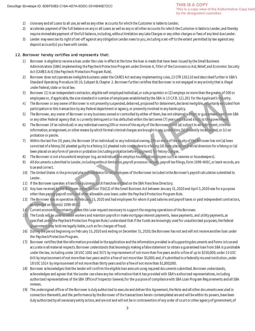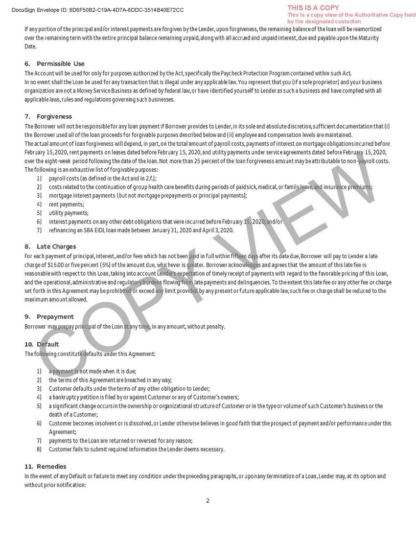 2 If any portion of the principal and/or interest payments are forgiven by the Lender, upon forgiveness, the remaining balance of the loan will be reamortized over the remaining term with the entire principal balance remaining unpaid, along with all accrued and unpaid interest, due and payable upon the Maturity Date. 6. Permissible Use The Account will be used for only for purposes authorized by the Act, specifically the Paycheck Protection Program contained within such Act. In no event shall the Loan be used for any transaction that is illegal under any applicable law. You represent that you (if a sole proprietor) and your business organization are not a Money Service Business as defined by federal law, or have identified yourself to Lender as such a business and have complied with all applicable laws, rules and regulations governing such businesses. 7. Forgiveness The Borrower will not be responsible for any loan payment if Borrower provides to Lender, in its sole and absolute discretion, sufficient documentation that (i) the Borrower used all of the loan proceeds for forgivable purposes described below and (ii) employee and compensation levels are maintained. The actual amount of loan forgiveness will depend, in part, on the total amount of payroll costs, payments of interest on mortgage obligations incurred before February 15, 2020, rent payments on leases dated before February 15, 2020, and utility payments under service agreements dated before February 15, 2020, over the eight-week period following the date of the loan. Not more than 25 percent of the loan forgiveness amount may be attributable to non-payroll costs. The following is an exhaustive list of forgivable purposes: 1) payroll costs (as defined in the Act and in 2.f.); 2) costs related to the continuation of group health care benefits during periods of paid sick, medical, or family leave, and insurance premiums; 3) mortgage interest payments (but not mortgage prepayments or principal payments); 4) rent payments; 5) utility payments; 6) interest payments on any other debt obligations that were incurred before February 15, 2020; and/or 7) refinancing an SBA EIDL loan made between January 31, 2020 and April 3, 2020. 8. Late Charges For each payment of principal, interest, and/or fees which has not been paid in full within fifteen days after its date due, Borrower will pay to Lender a late charge of $15.00 or five percent (5%) of the amount due, whichever is greater. Borrower acknowledges and agrees that the amount of this late fee is reasonable with respect to this Loan, taking into account Lender's expectation of timely receipt of payments with regard to the favorable pricing of this Loan, and the operational, administrative and regulatory burdens flowing from late payments and delinquencies. To the extent this late fee or any other fee or charge set forth in this Agreement may be prohibited or exceed any limit provided by any present or future applicable law, such fee or charge shall be reduced to the maximum amount allowed. 9. Prepayment Borrower may prepay principal of the Loan at any time, in any amount, without penalty. 10. Default The following constitute defaults under this Agreement: 1) a payment is not made when it is due; 2) the terms of this Agreement are breached in any way; 3) Customer defaults under the terms of any other obligation to Lender; 4) a bankruptcy petition is filed by or against Customer or any of Customer’s owners; 5) a significant change occurs in the ownership or organizational structure of Customer or in the type or volume of such Customer’s business or the death of a Customer; 6) Customer becomes insolvent or is dissolved, or Lender otherwise believes in good faith that the prospect of payment and/or performance under this Agreement; 7) payments to the Loan are returned or reversed for any reason; 8) Customer fails to submit required information the Lender deems necessary. 11. Remedies In the event of any Default or failure to meet any condition under the preceding paragraphs, or upon any termination of a Loan, Lender may, at its option and without prior notification: DocuSign Envelope ID: 6D6F50B2-C19A-4D7A-8DDC-3514B40E72CC THIS IS A COPY This is a copy view of the Authoritative Copy held by the designated custodian COPY VIEW