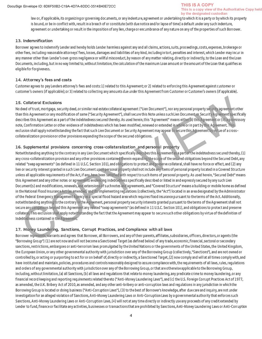4 law or, if applicable, its organizing or governing documents, or any indenture, agreement or undertaking to which it is a party or by which its property is bound, or be in conflict with, result in a breach of or constitute (with due notice and/or lapse of time) a default under any such indenture, agreement or undertaking or result in the imposition of any lien, charge or encumbrance of any nature on any of the properties of such Borrower. 13. Indemnification Borrower agrees to indemnify Lender and hereby holds Lender harmless against any and all claims, actions, suits, proceedings, costs, expenses, brokerage or other fees, including reasonable attorneys’ fees, losses, damages and liabilities of any kind, including in tort, penalties and interest, which Lender may incur in any manner other than Lender’s own gross negligence or willful misconduct, by reason of any matter relating, directly or indirectly, to the Loan and the Loan Documents, including, but in no way limited to, without limitation, the calculation of the maximum Loan amount or the amount of the Loan that qualifies as eligible for forgiveness. 14. Attorney’s fees and costs Customer agrees to pay Lenders attorney’s fees and costs: 1) related to this Agreement; or 2) related to enforcing this Agreement against customer or customer’s owners (if applicable); or 3) related to collecting any amounts due under this Agreement from Customer or Customer’s owners (if applicable). 15. Collateral Exclusions No deed of trust, mortgage, security deed, or similar real estate collateral agreement ("Lien Document"), nor any personal property security agreement other than this Agreement or any modification of same ("Security Agreement"), shall secure this Note unless such Lien Document or Security Agreement specifically describes this Agreement as a part of the indebtedness secured thereby. As used herein, this “Agreement" means either (i) this Agreement or (ii) a promissory note, Confirmation Letter or other evidence of indebtedness which has been modified, renewed or extended in whole or in part by this Agreement. This exclusion shall apply notwithstanding the fact that such Lien Document or Security Agreement may appear to secure this Agreement by virtue of a crosscollateralization provision or other provisions expanding the scope of the secured obligations. 16. Supplemental provisions concerning cross-collateralization and personal property Notwithstanding anything to the contrary in any Lien Document which specifically describes this Agreement as a part of the indebtedness secured thereby, (1) any cross-collateralization provision and any other provisions contained therein expanding the scope of the secured obligations beyond the Secured Debt, any related "swap agreements" (as defined in 11 U.S.C. Section 101), and obligations to protect and preserve collateral, shall have no force or effect, and (2) any lien or security interest granted in such Lien Document upon personal property shall not include any items of personal property located in a Covered Structure unless all applicable requirements of the Act, if any, have been satisfied with respect to such items of personal property. As used herein, "Secured Debt" means this Agreement and any other notes or agreements evidencing indebtedness specifically described or listed in and expressly secured by any such Lien Document(s) and modifications, renewals, and extensions of such notes and agreements, and "Covered Structure" means a building or mobile home as defined in the National Flood Insurance Act (as amended) and its implementing regulations (collectively, the "Act") located in an area designated by the Administrator of the Federal Emergency Management Agency as a special flood hazard area which requires flood insurance pursuant to the terms of the Act. Additionally, notwithstanding anything to the contrary in the Agreement, personal property security interests granted pursuant to the terms of the Agreement shall not secure any obligations beyond this Agreement any related "swap agreements" (as defined in 11 U.S.C. Section 101), and obligations to protect and preserve collateral. This exclusion shall apply notwithstanding the fact that the Agreement may appear to secure such other obligations by virtue of the definition of Indebtedness contained in the Agreement. 17. Money Laundering, Sanctions, Corrupt Practices, and Compliance with all laws Borrower represents, warrants and agrees that Borrower, all Borrowers, and any of their parents, affiliates, subsidiaries, officers, directors, or agents (the "Borrowing Group") (1) are not now and will not become a Sanctioned Target (as defined below) of any trade, economic, financial, sectoral or secondary sanctions, restrictions, embargoes or anti-terrorism laws promulgated by the United Nations or the governments of the United States, the United Kingdom, the European Union, or any other governmental authority with jurisdiction over any of the Borrowing Group (collectively, "Sanctions"), and are not owned or controlled by, or acting or purporting to act for or on behalf of, directly or indirectly, a Sanctioned Target, (2) now comply and will at all times comply with, and have instituted and maintain, policies, procedures and controls reasonably designed to assure compliance with, the requirements of all laws, rules, regulations and orders of any governmental authority with jurisdiction over any of the Borrowing Group, or that are otherwise applicable to the Borrowing Group, including, without limitation, (a) all Sanctions, (b) all laws and regulations that relate to money laundering, any predicate crime to money laundering, or any financial record keeping and reporting requirements related thereto ("Anti-Money Laundering Laws"), and (c) the U.S. Foreign Corrupt Practices Act of 1977, as amended, the U.K. Bribery Act of 2010, as amended, and any other anti-bribery or anti-corruption laws and regulations in any jurisdiction in which 