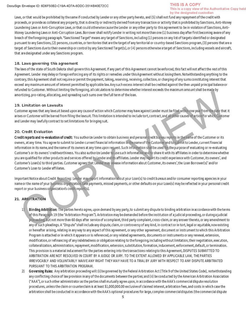 5 Laws, or that would be prohibited by the same if conducted by Lender or any other party hereto, and (5) shall not fund any repayment of the credit with proceeds, or provide as collateral any property, that is directly or indirectly derived from any transaction or activity that is prohibited by Sanctions, Anti-Money Laundering Laws or Anti-Corruption Laws, or that could otherwise cause the Lender or any other party to this agreement to be in violation of Sanctions, Anti- Money Laundering Laws or Anti-Corruption Laws. Borrower shall notify Lender in writing not more than one (1) business day after first becoming aware of any breach of the foregoing paragraph. "Sanctioned Target" means any target of Sanctions, including (1) persons on any list of targets identified or designated pursuant to any Sanctions, (2) persons, countries, or territories that are the target of any territorial or country-based Sanctions program, (3) persons that are a target of Sanctions due to their ownership or control by any Sanctioned Target(s), or (4) persons otherwise a target of Sanctions, including vessels and aircraft, that are designated under any Sanctions program. 18. Laws governing this agreement The laws of the state of South Dakota shall govern this Agreement. If any part of this Agreement cannot be enforced, this fact will not affect the rest of this Agreement. Lender may delay or forego enforcing any of its rights or remedies under this Agreement without losing them. Notwithstanding anything to the contrary, this Agreement shall not require or permit the payment, taking, reserving, receiving, collection, or charging of any sums constituting interest that exceed any maximum amount of interest permitted by applicable law. Any such excess interest shall be credited against the then unpaid principal balance or refunded to Customer. Without limiting the foregoing, all calculations to determine whether interest exceeds the maximum amount shall be made by amortizing, pro-rating, allocating, and spreading such sums over the full term of the loan. 19. Limitation on Lawsuits Customer agrees that any lawsuit based upon any cause of action which Customer may have against Lender must be filed within one year from the date that it arises or Customer will be barred from filing the lawsuit. This limitation is intended to include tort, contract, and all other causes of action for which Customer and Lender may lawfully contract to set limitations for bringing suit. 20. Credit Evaluation Credit reports and re-evaluation of credit: You authorize Lender to obtain business and personal credit bureau reports in the name of the Customer or its owners, at any time. You agree to submit to Lender current financial information in the name of the Customer and to submit to Lender, current financial information in its name, and the name of its owners at any time upon request. Such information shall be used for the purpose of evaluating or re-evaluating Customer’s or its owners’ creditworthiness. You also authorize Lender to use such information and to share it with its affiliates in order to determine whether you are qualified for other products and services offered by Lender and its affiliates. Lender may report its credit experience with Customer, its owners’, and Customer’s Loan(s) to third parties. Customer agrees that Lender may release information about Customer, its owners’, the Loan Borrower(s)’ and/or Customer’s Loan to Lender affiliates. Important Notice about Credit Reporting: Lender may report information about your Loan(s) to credit bureaus and/or consumer reporting agencies in your name or the name of your business organization. Late payments, missed payments, or other defaults on your Loan(s) may be reflected in your personal credit report or your business organization’s credit report(s). 21. ARBITRATION 1) Binding Arbitration: The parties hereto agree, upon demand by any party, to submit any dispute to binding arbitration in accordance with the terms of this Paragraph 19 (the “Arbitration Program”). Arbitration may be demanded before the institution of a judicial proceeding, or during a judicial proceeding, but not more than 60 days after service of a complaint, third party complaint, cross-claim, or any answer thereto, or any amendment to any of such pleadings. A “Dispute” shall include any dispute, claim, or controversy of any kind, in contract or in tort, legal or equitable, now existing or hereafter arising, relating in any way to any aspect of this agreement, or any other agreement, document or instrument to which this Arbitration Program is attached or in which it appears or is referenced, or any related agreements, documents or instruments or any renewal, extension, modification, or refinancing of any indebtedness or obligation relating to the foregoing, including without limitation, their negotiation, execution, collateralization, administration, repayment, modification, extension, substitution, formation, inducement, enforcement, default, or termination. This provision is a material inducement for the parties entering into the transactions relating to this Agreement, DISPUTES SUBMITTED TO ARBITRATION ARE NOT RESOLVED IN COURT BY A JUDGE OR JURY. TO THE EXTENT ALLOWED BY APPLICABLE LAW, THE PARTIES IRREVOCABLY AND VOLUNTARILY WAIVE ANY RIGHT THEY MAY HAVE TO A TRIAL BY JURY WITH RESPECT TO ANY DISPUTE ARBITRATED PURSUANT TO THIS ARBITRATION PROGRAM. 2) Go verning Rules: Any arbitration proceeding will: (i) be governed by the Federal Arbitration Act (Title 9 of the United States Code), notwithstanding any conflicting choice of law provision in any of the documents between the parties; and (ii) be conducted by the American Arbitration Association (“AAA”), or such other administrator as the parties shall mutually agree upon, in accordance with the AAA’s commercial dispute resolution procedures, unless the claim or counterclaim is at least $1,000,000.00 exclusive of claimed interes