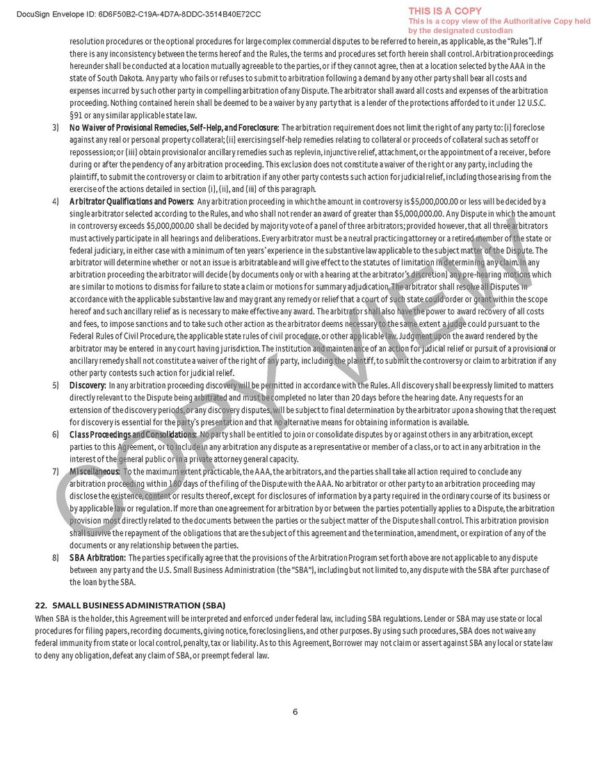 6 resolution procedures or the optional procedures for large complex commercial disputes to be referred to herein, as applicable, as the “Rules”). If there is any inconsistency between the terms hereof and the Rules, the terms and procedures set forth herein shall control. Arbitration proceedings hereunder shall be conducted at a location mutually agreeable to the parties, or if they cannot agree, then at a location selected by the AAA in the state of South Dakota. Any party who fails or refuses to submit to arbitration following a demand by any other party shall bear all costs and expenses incurred by such other party in compelling arbitration of any Dispute. The arbitrator shall award all costs and expenses of the arbitration proceeding. Nothing contained herein shall be deemed to be a waiver by any party that is a lender of the protections afforded to it under 12 U.S.C. §91 or any similar applicable state law. 3) No Waiver of Provisional Remedies, Self-Help, and Foreclosure: The arbitration requirement does not limit the right of any party to: (i) foreclose against any real or personal property collateral; (ii) exercising self-help remedies relating to collateral or proceeds of collateral such as setoff or repossession; or (iii) obtain provisional or ancillary remedies such as replevin, injunctive relief, attachment, or the appointment of a receiver, before during or after the pendency of any arbitration proceeding. This exclusion does not constitute a waiver of the right or any party, including the plaintiff, to submit the controversy or claim to arbitration if any other party contests such action for judicial relief, including those arising from the exercise of the actions detailed in section (i), (ii), and (iii) of this paragraph. 4) Arbitrator Qualifications and Powers: Any arbitration proceeding in which the amount in controversy is $5,000,000.00 or less will be decided by a single arbitrator selected according to the Rules, and who shall not render an award of greater than $5,000,000.00. Any Dispute in which the amount in controversy exceeds $5,000,000.00 shall be decided by majority vote of a panel of three arbitrators; provided however, that all three arbitrators must actively participate in all hearings and deliberations. Every arbitrator must be a neutral practicing attorney or a retired member of the state or federal judiciary, in either case with a minimum of ten years’ experience in the substantive law applicable to the subject matter of the Dispute. The arbitrator will determine whether or not an issue is arbitratable and will give effect to the statutes of limitation in determining any claim. In any arbitration proceeding the arbitrator will decide (by documents only or with a hearing at the arbitrator’s discretion) any pre-hearing motions which are similar to motions to dismiss for failure to state a claim or motions for summary adjudication. The arbitrator shall resolve all Disputes in accordance with the applicable substantive law and may grant any remedy or relief that a court of such state could order or grant within the scope hereof and such ancillary relief as is necessary to make effective any award. The arbitrator shall also have the power to award recovery of all costs and fees, to impose sanctions and to take such other action as the arbitrator deems necessary to the same extent a judge could pursuant to the Federal Rules of Civil Procedure, the applicable state rules of civil procedure, or other applicable law. Judgment upon the award rendered by the arbitrator may be entered in any court having jurisdiction. The institution and maintenance of an action for judicial relief or pursuit of a provisional or ancillary remedy shall not constitute a waiver of the right of any party, including the plaintiff, to submit the controversy or claim to arbitration if any other party contests such action for judicial relief. 5) Di scovery: In any arbitration proceeding discovery will be permitted in accordance with the Rules. All discovery shall be expressly limited to matters directly relevant to the Dispute being arbitrated and must be completed no later than 20 days before the hearing date. Any requests for an extension of the discovery periods, or any discovery disputes, will be subject to final determination by the arbitrator upon a showing that the request for discovery is essential for the party’s presentation and that no alternative means for obtaining information is available. 6) Cl ass Proceedings and Consolidations: No party shall be entitled to join or consolidate disputes by or against others in any arbitration, except parties to this Agreement, or to include in any arbitration any dispute as a representative or member of a class, or to act in any arbitration in the interest of the general public or in a private attorney general capacity. 7) Mi scellaneous: To the maximum extent practicable, the AAA, the arbitrators, and the parties shall take all action required to conclude any arbitration proceeding within 180 days of the filing of the Dispute with the AAA. No arbitrator or other party to an arbitration proceeding may disclose the existence, content or results thereof, except for disclosures of information by a party required in the ordinary course of its business or by applicable law or regulation. If more than one agreement for arbitration by or between the parties potentially applies to a Dispute, the arbitration provision most directly related to the documents between the parties or the subject matter of the Dispute shall control. This arbitration provision shall survive the repayment of the obligations that are the subject of this agreement and the termination, amendment, or expiration of any of the documents or any relationship between the parties. 8) SBA Arbitration: The parties specifically agree that the provisions of the Arbitration Program set forth above are not applicable to any dispute between any party and the U.S. Small Business Adm