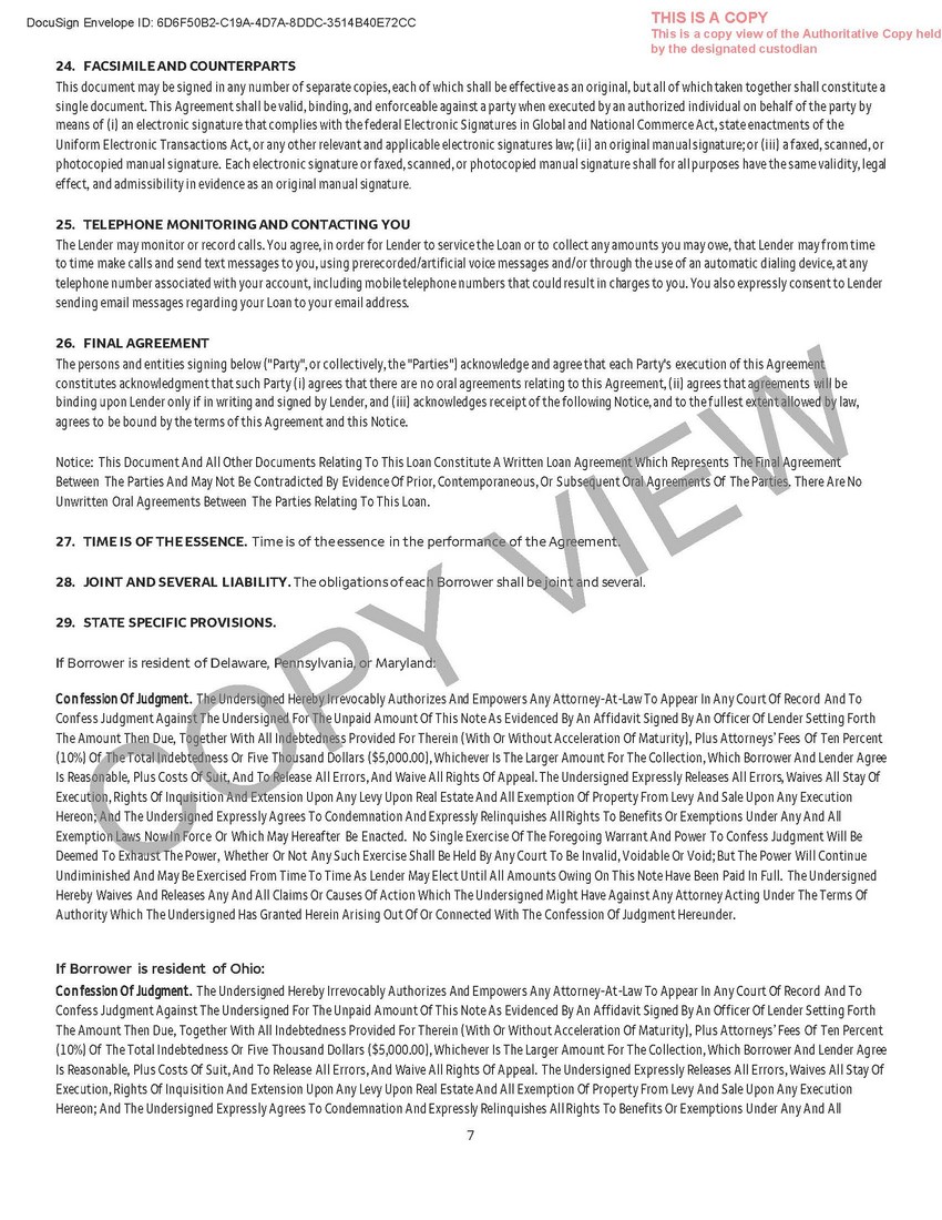 7 24. FACSIMILE AND COUNTERPARTS This document may be signed in any number of separate copies, each of which shall be effective as an original, but all of which taken together shall constitute a single document. This Agreement shall be valid, binding, and enforceable against a party when executed by an authorized individual on behalf of the party by means of (i) an electronic signature that complies with the federal Electronic Signatures in Global and National Commerce Act, state enactments of the Uniform Electronic Transactions Act, or any other relevant and applicable electronic signatures law; (ii) an original manual signature; or (iii) a faxed, scanned, or photocopied manual signature. Each electronic signature or faxed, scanned, or photocopied manual signature shall for all purposes have the same validity, legal effect, and admissibility in evidence as an original manual signature. 25. TELEPHONE MONITORING AND CONTACTING YOU The Lender may monitor or record calls. You agree, in order for Lender to service the Loan or to collect any amounts you may owe, that Lender may from time to time make calls and send text messages to you, using prerecorded/artificial voice messages and/or through the use of an automatic dialing device, at any telephone number associated with your account, including mobile telephone numbers that could result in charges to you. You also expressly consent to Lender sending email messages regarding your Loan to your email address. 26. FINAL AGREEMENT The persons and entities signing below ("Party", or collectively, the "Parties") acknowledge and agree that each Party's execution of this Agreement constitutes acknowledgment that such Party (i) agrees that there are no oral agreements relating to this Agreement, (ii) agrees that agreements will be binding upon Lender only if in writing and signed by Lender, and (iii) acknowledges receipt of the following Notice, and to the fullest extent allowed by law, agrees to be bound by the terms of this Agreement and this Notice. Notice: This Document And All Other Documents Relating To This Loan Constitute A Written Loan Agreement Which Represents The Final Agreement Between The Parties And May Not Be Contradicted By Evidence Of Prior, Contemporaneous, Or Subsequent Oral Agreements Of The Parties. There Are No Unwritten Oral Agreements Between The Parties Relating To This Loan. 27. TIME IS OF THE ESSENCE. Time is of the essence in the performance of the Agreement. 28. JOINT AND SEVERAL LIABILITY. The obligations of each Borrower shall be joint and several. 29. STATE SPECIFIC PROVISIONS. If Borrower is resident of Delaware, Pennsylvania, or Maryland: Co n fession Of Judgment. The Undersigned Hereby Irrevocably Authorizes And Empowers Any Attorney-At-Law To Appear In Any Court Of Record And To Confess Judgment Against The Undersigned For The Unpaid Amount Of This Note As Evidenced By An Affidavit Signed By An Officer Of Lender Setting Forth The Amount Then Due, Together With All Indebtedness Provided For Therein (With Or Without Acceleration Of Maturity), Plus Attorneys’ Fees Of Ten Percent (10%) Of The Total Indebtedness Or Five Thousand Dollars ($5,000.00), Whichever Is The Larger Amount For The Collection, Which Borrower And Lender Agree Is Reasonable, Plus Costs Of Suit, And To Release All Errors, And Waive All Rights Of Appeal. The Undersigned Expressly Releases All Errors, Waives All Stay Of Execution, Rights Of Inquisition And Extension Upon Any Levy Upon Real Estate And All Exemption Of Property From Levy And Sale Upon Any Execution Hereon; And The Undersigned Expressly Agrees To Condemnation And Expressly Relinquishes All Rights To Benefits Or Exemptions Under Any And All Exemption Laws Now In Force Or Which May Hereafter Be Enacted. No Single Exercise Of The Foregoing Warrant And Power To Confess Judgment Will Be Deemed To Exhaust The Power, Whether Or Not Any Such Exercise Shall Be Held By Any Court To Be Invalid, Voidable Or Void; But The Power Will Continue Undiminished And May Be Exercised From Time To Time As Lender May Elect Until All Amounts Owing On This Note Have Been Paid In Full. The Undersigned Hereby Waives And Releases Any And All Claims Or Causes Of Action Which The Undersigned Might Have Against Any Attorney Acting Under The Terms Of Authority Which The Undersigned Has Granted Herein Arising Out Of Or Connected With The Confession Of Judgment Hereunder. If Borrower is resident of Ohio: Co n fession Of Judgment. The Undersigned Hereby Irrevocably Authorizes And Empowers Any Attorney-At-Law To Appear In Any Court Of Record And To Confess Judgment Against The Undersigned For The Unpaid Amount Of This Note As Evidenced By An Affidavit Signed By An Officer Of Lender Setting Forth The Amount Then Due, Together With All Indebtedness Provided For Therein (With Or Without Acceleration Of Maturity), Plus Attorneys’ Fees Of Ten Percent (10%) Of The Total Indebtedness Or Five Thousand Dollars ($5,000.00), Whichever Is The Larger Amount For The Collection, Which Borrower And Lender Agree Is Reasonable, Plus Costs Of Suit, And To Release All Errors, And Waive All Rights Of Appeal. The Undersigned Expressly Releases All Errors, Waives All Stay Of Execution, Rights Of Inquisition And Extension Upon Any Levy Upon Real Estate And All Exemption Of Property From Levy And Sale Upon Any Execution Hereon; And The Undersigned Expressly Agrees To Condemnation And Expressly Relinquishes All Rights To Benefits Or Exemptions Under Any And All DocuSign Envelope ID: 6D6F50B2-C19A-4D7A-8DDC-3514B40E72CC THIS IS A COPY This is a copy view of the Authoritative Copy held by the designated custodian COPY VIEW