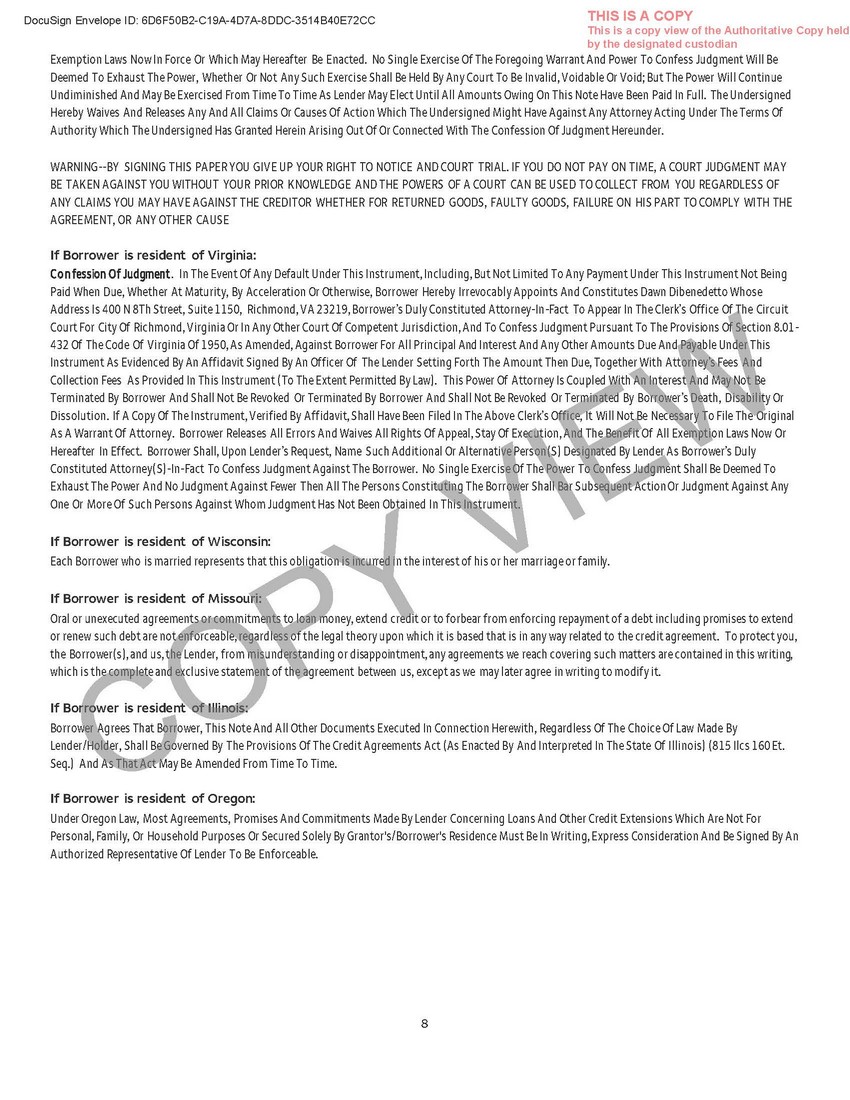 8 Exemption Laws Now In Force Or Which May Hereafter Be Enacted. No Single Exercise Of The Foregoing Warrant And Power To Confess Judgment Will Be Deemed To Exhaust The Power, Whether Or Not Any Such Exercise Shall Be Held By Any Court To Be Invalid, Voidable Or Void; But The Power Will Continue Undiminished And May Be Exercised From Time To Time As Lender May Elect Until All Amounts Owing On This Note Have Been Paid In Full. The Undersigned Hereby Waives And Releases Any And All Claims Or Causes Of Action Which The Undersigned Might Have Against Any Attorney Acting Under The Terms Of Authority Which The Undersigned Has Granted Herein Arising Out Of Or Connected With The Confession Of Judgment Hereunder. WARNING--BY SIGNING THIS PAPER YOU GIVE UP YOUR RIGHT TO NOTICE AND COURT TRIAL. IF YOU DO NOT PAY ON TIME, A COURT JUDGMENT MAY BE TAKEN AGAINST YOU WITHOUT YOUR PRIOR KNOWLEDGE AND THE POWERS OF A COURT CAN BE USED TO COLLECT FROM YOU REGARDLESS OF ANY CLAIMS YOU MAY HAVE AGAINST THE CREDITOR WHETHER FOR RETURNED GOODS, FAULTY GOODS, FAILURE ON HIS PART TO COMPLY WITH THE AGREEMENT, OR ANY OTHER CAUSE If Borrower is resident of Virginia: Co n fession Of Judgment. In The Event Of Any Default Under This Instrument, Including, But Not Limited To Any Payment Under This Instrument Not Being Paid When Due, Whether At Maturity, By Acceleration Or Otherwise, Borrower Hereby Irrevocably Appoints And Constitutes Dawn Dibenedetto Whose Address Is 400 N 8Th Street, Suite 1150, Richmond, VA 23219, Borrower’s Duly Constituted Attorney-In-Fact To Appear In The Clerk’s Office Of The Circuit Court For City Of Richmond, Virginia Or In Any Other Court Of Competent Jurisdiction, And To Confess Judgment Pursuant To The Provisions Of Section 8.01- 432 Of The Code Of Virginia Of 1950, As Amended, Against Borrower For All Principal And Interest And Any Other Amounts Due And Payable Under This Instrument As Evidenced By An Affidavit Signed By An Officer Of The Lender Setting Forth The Amount Then Due, Together With Attorney’s Fees And Collection Fees As Provided In This Instrument (To The Extent Permitted By Law). This Power Of Attorney Is Coupled With An Interest And May Not Be Terminated By Borrower And Shall Not Be Revoked Or Terminated By Borrower And Shall Not Be Revoked Or Terminated By Borrower’s Death, Disability Or Dissolution. If A Copy Of The Instrument, Verified By Affidavit, Shall Have Been Filed In The Above Clerk’s Office, It Will Not Be Necessary To File The Original As A Warrant Of Attorney. Borrower Releases All Errors And Waives All Rights Of Appeal, Stay Of Execution, And The Benefit Of All Exemption Laws Now Or Hereafter In Effect. Borrower Shall, Upon Lender’s Request, Name Such Additional Or Alternative Person(S) Designated By Lender As Borrower’s Duly Constituted Attorney(S)-In-Fact To Confess Judgment Against The Borrower. No Single Exercise Of The Power To Confess Judgment Shall Be Deemed To Exhaust The Power And No Judgment Against Fewer Then All The Persons Constituting The Borrower Shall Bar Subsequent Action Or Judgment Against Any One Or More Of Such Persons Against Whom Judgment Has Not Been Obtained In This Instrument. If Borrower is resident of Wisconsin: Each Borrower who is married represents that this obligation is incurred in the interest of his or her marriage or family. If Borrower is resident of Missouri: Oral or unexecuted agreements or commitments to loan money, extend credit or to forbear from enforcing repayment of a debt including promises to extend or renew such debt are not enforceable, regardless of the legal theory upon which it is based that is in any way related to the credit agreement. To protect you, the Borrower(s), and us, the Lender, from misunderstanding or disappointment, any agreements we reach covering such matters are contained in this writing, which is the complete and exclusive statement of the agreement between us, except as we may later agree in writing to modify it. If Borrower is resident of Illinois: Borrower Agrees That Borrower, This Note And All Other Documents Executed In Connection Herewith, Regardless Of The Choice Of Law Made By Lender/Holder, Shall Be Governed By The Provisions Of The Credit Agreements Act (As Enacted By And Interpreted In The State Of Illinois) (815 Ilcs 160 Et. Seq.) And As That Act May Be Amended From Time To Time. If Borrower is resident of Oregon: Under Oregon Law, Most Agreements, Promises And Commitments Made By Lender Concerning Loans And Other Credit Extensions Which Are Not For Personal, Family, Or Household Purposes Or Secured Solely By Grantor's/Borrower's Residence Must Be In Writing, Express Consideration And Be Signed By An Authorized Representative Of Lender To Be Enforceable. DocuSign Envelope ID: 6D6F50B2-C19A-4D7A-8DDC-3514B40E72CC THIS IS A COPY This is a copy view of the Authoritative Copy held by the designated custodian COPY VIEW