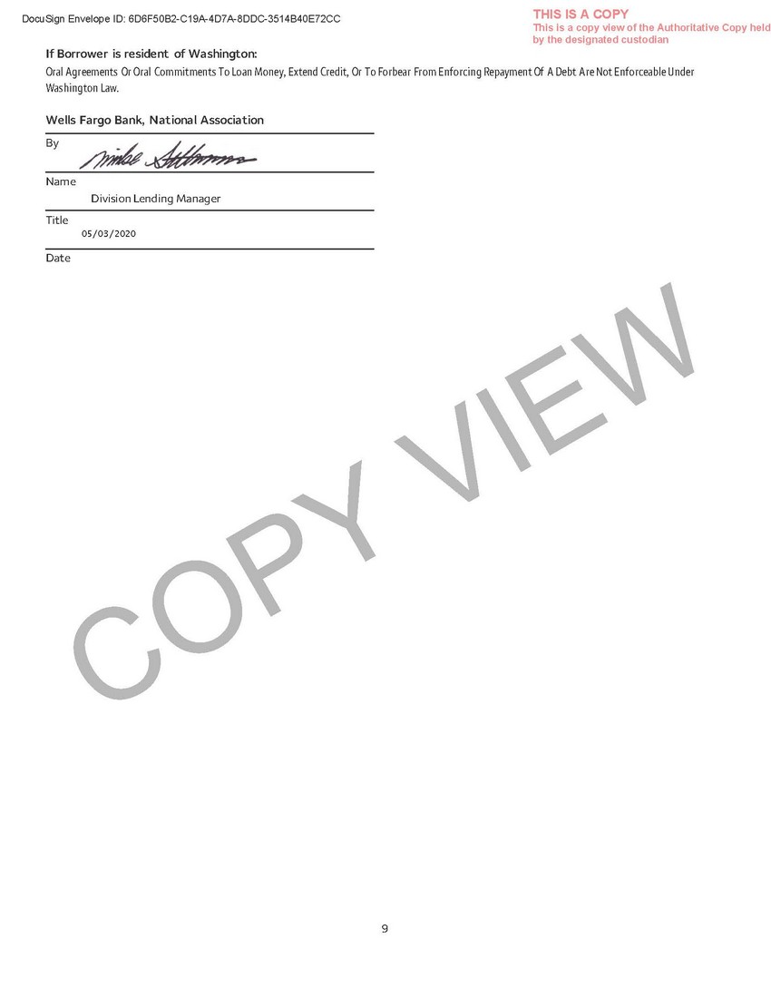 9 If Borrower is resident of Washington: Oral Agreements Or Oral Commitments To Loan Money, Extend Credit, Or To Forbear From Enforcing Repayment Of A Debt Are Not Enforceable Under Washington Law. Wells Fargo Bank, National Association By Name Division Lending Manager Title Date DocuSign Envelope ID: 6D6F50B2-C19A-4D7A-8DDC-3514B40E72CC 05/03/2020 THIS IS A COPY This is a copy view of the Authoritative Copy held by the designated custodian COPY VIEW