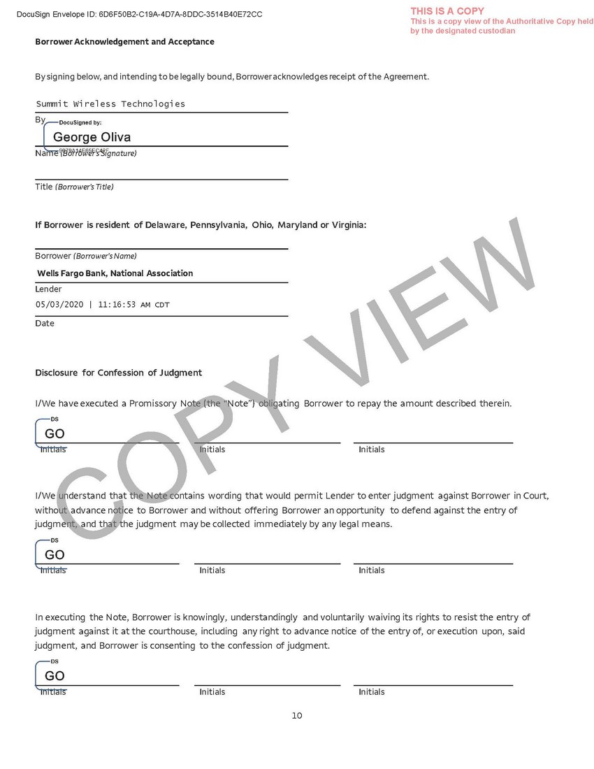 10 Borrower Acknowledgement and Acceptance By signing below, and intending to be legally bound, Borrower acknowledges receipt of the Agreement. By Name (Borrower’s Signature) Title (Borrower’s Title) If Borrower is resident of Delaware, Pennsylvania, Ohio, Maryland or Virginia: Borrower (Borrower’s Name) Wells Fargo Bank, National Association Lender Date Disclosure for Confession of Judgment I/We have executed a Promissory Note (the “Note”) obligating Borrower to repay the amount described therein. Initials Initials Initials I/We understand that the Note contains wording that would permit Lender to enter judgment against Borrower in Court, without advance notice to Borrower and without offering Borrower an opportunity to defend against the entry of judgment, and that the judgment may be collected immediately by any legal means. Initials Initials Initials In executing the Note, Borrower is knowingly, understandingly and voluntarily waiving its rights to resist the entry of judgment against it at the courthouse, including any right to advance notice of the entry of, or execution upon, said judgment, and Borrower is consenting to the confession of judgment. Initials Initials Initials DocuSign Envelope ID: 6D6F50B2-C19A-4D7A-8DDC-3514B40E72CC CA 05/03/2020 | 11:16:53 AM CDT Summit Wireless Technologies THIS IS A COPY This is a copy view of the Authoritative Copy held by the designated custodian COPY VIEW