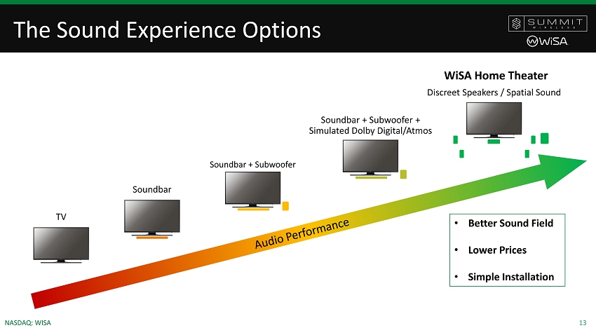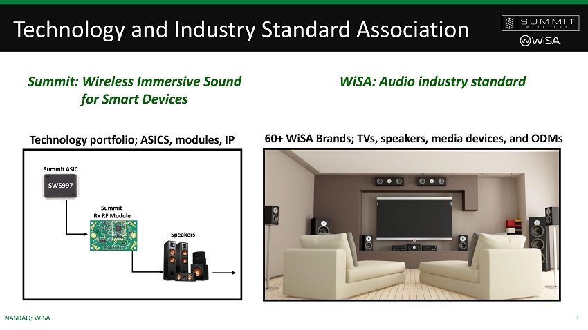 2 NASDAQ: WISA Forward Looking Statements This presentation contains forward - looking statements within the meaning of Section 27 A of the Securities Act of 1933 , as amended, and Section 21 E of the Securities Exchange Act of 1934 , as amended . Readers are cautioned not to place undue reliance on these forward - looking statements . Actual results may differ materially from those indicated by these forward - looking statements as a result of risks and uncertainties impacting Summit Wireless’ business including, current macroeconomic uncertainties associated with the COVID - 19 pandemic, our the ability to predict the timing of design wins entering production and the potential future revenue associated with design wins ; rate of growth ; the ability to predict customer demand for existing and future products and to secure adequate manufacturing capacity ; consumer demand conditions affecting customers’ end markets ; the ability to hire, retain and motivate employees ; the effects of competition, including price competition ; technological, regulatory and legal developments ; developments in the economy and financial markets and other risks detailed from time to time in Summit Wireless’ filings with the Securities and Exchange Commission . * WiSA Ready TVs, gaming PCs and console systems are "ready" to transmit audio to WiSA Certified speakers when a WiSA USB Transmitter is plugged in and a user interface is activated through an APP or product design like LG TVs. © 2020 Summit Wireless Technologies, Inc. All rights reserved. Summit Wireless Technologies and the Summit Wireless logo are trademarks of Summit Wireless Technologies, Inc. The WiSA logo, WiSA, WiSA Ready, and WiSA Certified are trademarks, or certification marks of WiSA LLC. Third - party trade names, trademarks and product names are the intellectual property of their respective owners and product names are the intellectual property of their respective owners.