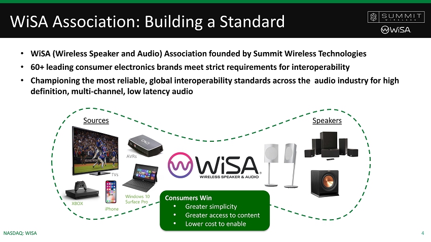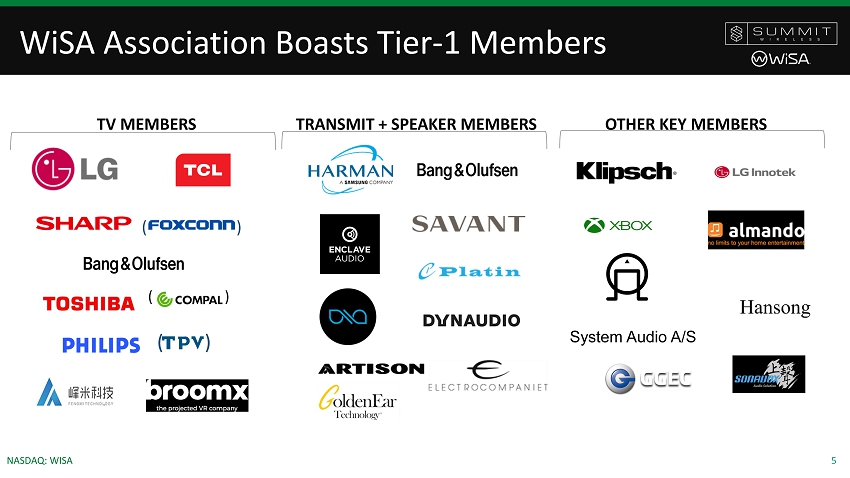 3 NASDAQ: WISA Technology and Industry Standard Association Summit Rx RF Module Summit ASIC Speakers SWS997 4 WiSA: Audio industry standard Technology portfolio; ASICS, modules, IP 60+ WiSA Brands; TVs, speakers, media devices, and ODMs Summit: Wireless Immersive Sound for Smart Devices