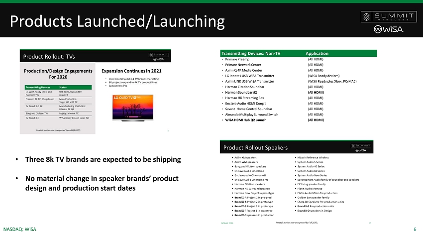 5 NASDAQ: WISA WiSA Association Boasts Tier - 1 Members OTHER KEY MEMBERS TRANSMIT + SPEAKER MEMBERS ( ) ( ) TV MEMBERS ( ) System Audio A/S