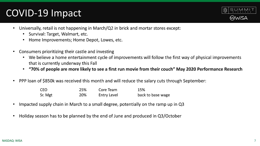 6 NASDAQ: WISA Products Launched/Launching • Three 8k TV brands are expected to be shipping • No material change in speaker brands’ product design and production start dates