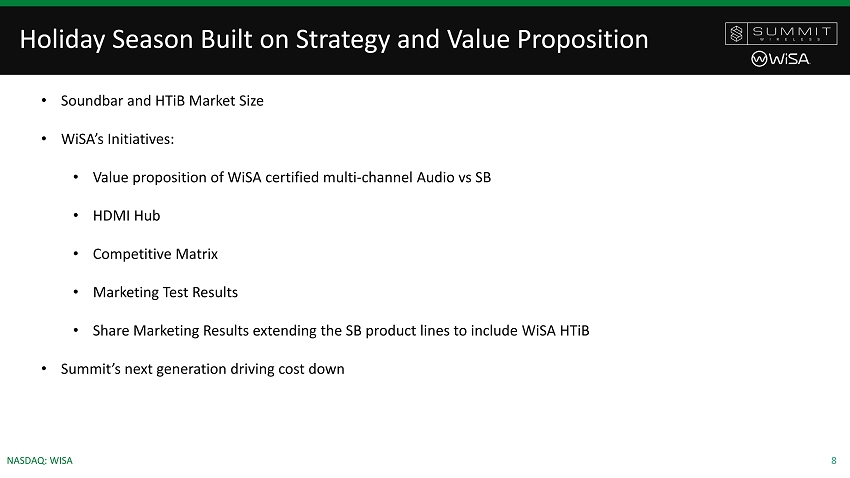 7 NASDAQ: WISA COVID - 19 Impact • Universally, retail is not happening in March/Q2 in brick and mortar stores except: • Survival: Target, Walmart, etc. • Home Improvements; Home Depot, Lowes, etc. • Consumers prioritizing their castle and investing • We believe a home entertainment cycle of improvements will follow the first way of physical improvements that is currently underway this Fall • “70% of people are more likely to see a first run movie from their couch” May 2020 Performance Research • PPP loan of $850k was received this month and will reduce the salary cuts through September: • Impacted supply chain in March to a small degree, potentially on the ramp up in Q3 • Holiday season has to be planned by the end of June and produced in Q3/October CEO 25% Core Team 15% Sr. Mgt 20% Entry Level back to base wage