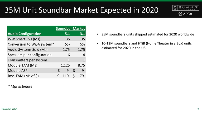8 NASDAQ: WISA Holiday Season Built on Strategy and Value Proposition • Soundbar and HTiB Market Size • WiSA’s Initiatives: • Value proposition of WiSA certified multi - channel Audio vs SB • HDMI Hub • Competitive Matrix • Marketing Test Results • Share Marketing Results extending the SB product lines to include WiSA HTiB • Summit’s next generation driving cost down
