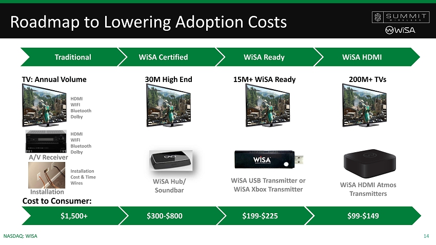 13 NASDAQ: WISA The Sound Experience Options Soundbar TV Soundbar + Subwoofer + Simulated Dolby Digital/Atmos Soundbar + Subwoofer Discreet Speakers / Spatial Sound WiSA Home Theater • Better Sound Field • Lower Prices • Simple Installation