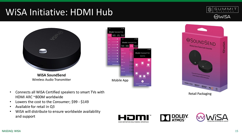 14 NASDAQ: WISA Roadmap to Lowering Adoption Costs TV: Annual Volume HDMI WIFI Bluetooth Dolby A/V Receiver Installation Installation Cost & Time Wires HDMI WIFI Bluetooth Dolby WiSA Hub/ Soundbar 30M High End WiSA USB Transmitter or WiSA Xbox Transmitter 15M+ WiSA Ready 200M+ TVs WiSA HDMI WiSA Ready WiSA Certified Traditional Cost to Consumer: $99 - $149 $199 - $225 $300 - $800 $1,500+ WiSA HDMI Atmos Transmitters