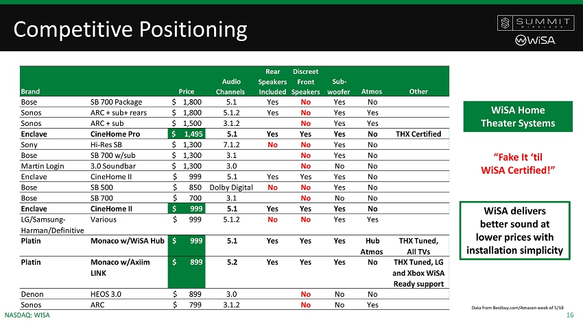 15 NASDAQ: WISA WiSA Initiative: HDMI Hub • Connects all WiSA Certified speakers to smart TVs with HDMI ARC ~800M worldwide • Lowers the cost to the Consumer; $99 - $149 • Available for retail in Q3 • WiSA will distribute to ensure worldwide availability and support WiSA SoundSend Wireless Audio Transmitter Mobile App Retail Packaging