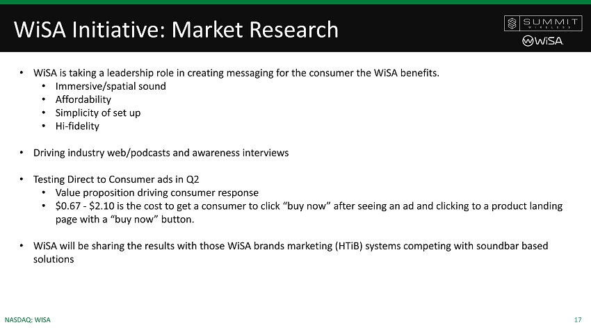 16 NASDAQ: WISA Competitive Positioning WiSA delivers better sound at lower prices with installation simplicity WiSA Home Theater Systems “Fake It ‘til WiSA Certified!” Data from Bestbuy.com/Amazon week of 5/18 Brand Price Audio Channels Rear Speakers Included Discreet Front Speakers Sub- woofer Atmos Other Bose SB 700 Package 1,800$ 5.1 Yes No Yes No Sonos ARC + sub+ rears 1,800$ 5.1.2 Yes No Yes Yes Sonos ARC + sub 1,500$ 3.1.2 No Yes Yes Enclave CineHome Pro $ 1,495 5.1 Yes Yes Yes No THX Certified Sony Hi-Res SB 1,300$ 7.1.2 No No Yes No Bose SB 700 w/sub 1,300$ 3.1 No Yes No Martin Login 3.0 Soundbar 1,300$ 3.0 No No No Enclave CineHome II 999$ 5.1 Yes Yes Yes No Bose SB 500 850$ Dolby Digital No No Yes No Bose SB 700 700$ 3.1 No No No Enclave CineHome II $ 999 5.1 Yes Yes Yes No LG/Samsung- Harman/Definitive Various 999$ 5.1.2 No No Yes Yes Platin Monaco w/WiSA Hub $ 999 5.1 Yes Yes Yes Hub Atmos THX Tuned, All TVs Platin Monaco w/Axiim LINK $ 899 5.2 Yes Yes Yes No THX Tuned, LG and Xbox WiSA Ready support Denon HEOS 3.0 899$ 3.0 No No No Sonos ARC 799$ 3.1.2 No No Yes