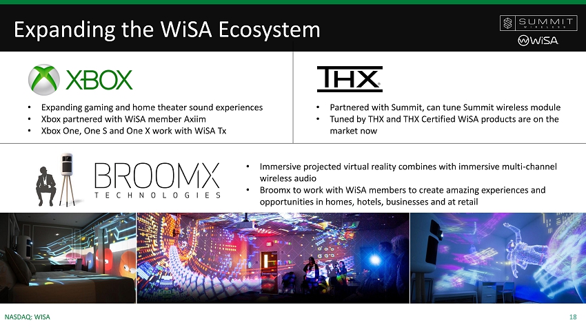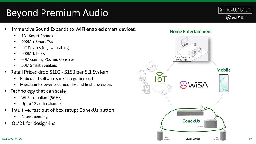 18 NASDAQ: WISA Expanding the WiSA Ecosystem • Expanding gaming and home theater sound experiences • Xbox partnered with WiSA member Axiim • Xbox One, One S and One X work with WiSA Tx • Partnered with Summit, can tune Summit wireless module • Tuned by THX and THX Certified WiSA products are on the market now • Immersive projected virtual reality combines with immersive multi - channel wireless audio • Broomx to work with WiSA members to create amazing experiences and opportunities in homes, hotels, businesses and at retail