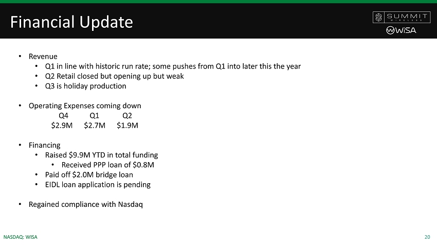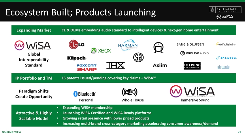 20 NASDAQ: WISA Financial Update • Revenue • Q1 in line with historic run rate; some pushes from Q1 into later this the year • Q2 Retail closed but opening up but weak • Q3 is holiday production • Operating Expenses coming down Q4 Q1 Q2 $2.9M $2.7M $1.9M • Financing • Raised $9.9M YTD in total funding • Received PPP loan of $0.8M • Paid off $2.0M bridge loan • EIDL loan application is pending • Regained compliance with Nasdaq