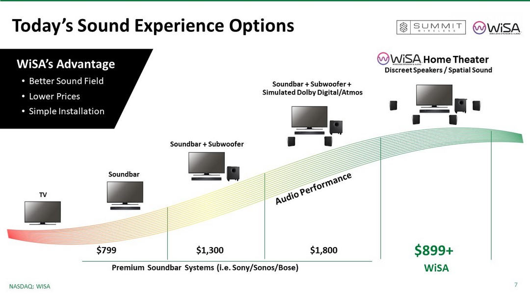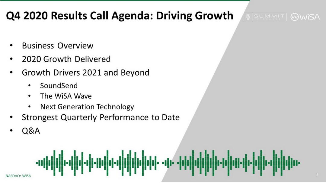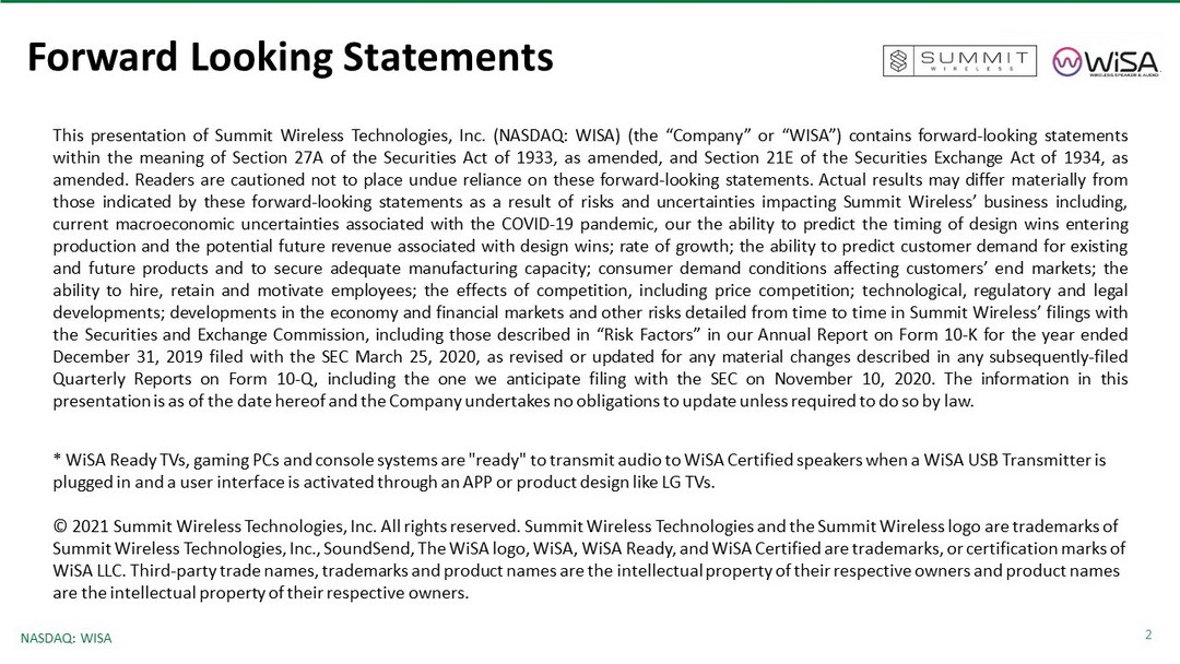 2 NASDAQ: WISA Forward Looking Statements This presentation of Summit Wireless Technologies, Inc . (NASDAQ : WISA) (the “Company” or “WISA”) contains forward - looking statements within the meaning of Section 27 A of the Securities Act of 1933 , as amended, and Section 21 E of the Securities Exchange Act of 1934 , as amended . Readers are cautioned not to place undue reliance on these forward - looking statements . Actual results may differ materially from those indicated by these forward - looking statements as a result of risks and uncertainties impacting Summit Wireless’ business including, current macroeconomic uncertainties associated with the COVID - 19 pandemic, our the ability to predict the timing of design wins entering production and the potential future revenue associated with design wins ; rate of growth ; the ability to predict customer demand for existing and future products and to secure adequate manufacturing capacity ; consumer demand conditions affecting customers’ end markets ; the ability to hire, retain and motivate employees ; the effects of competition, including price competition ; technological, regulatory and legal developments ; developments in the economy and financial markets and other risks detailed from time to time in Summit Wireless’ filings with the Securities and Exchange Commission, including those described in “Risk Factors” in our Annual Report on Form 10 - K for the year ended December 31 , 2019 filed with the SEC March 25 , 2020 , as revised or updated for any material changes described in any subsequently - filed Quarterly Reports on Form 10 - Q, including the one we anticipate filing with the SEC on November 10 , 2020 . The information in this presentation is as of the date hereof and the Company undertakes no obligations to update unless required to do so by law . * WiSA Ready TVs, gaming PCs and console systems are "ready" to transmit audio to WiSA Certified speakers when a WiSA USB Tra nsm itter is plugged in and a user interface is activated through an APP or product design like LG TVs. © 2021 Summit Wireless Technologies, Inc. All rights reserved. Summit Wireless Technologies and the Summit Wireless logo are tra demarks of Summit Wireless Technologies, Inc., SoundSend, The WiSA logo, WiSA, WiSA Ready, and WiSA Certified are trademarks, or certifi cat ion marks of WiSA LLC. Third - party trade names, trademarks and product names are the intellectual property of their respective owners and pro duct names are the intellectual property of their respective owners.