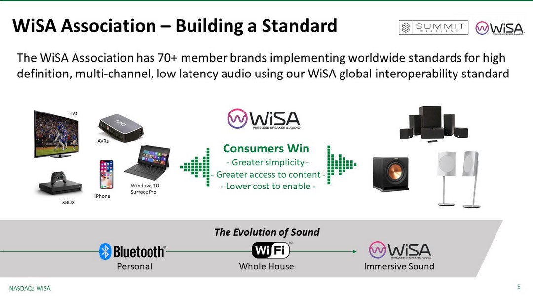4 NASDAQ: WISA Markets and sells ASICS, modules & IP that is integrated into leading TV & speaker brands Association with 70+ leading CE brands implementing WiSA global interoperability standard Summit Wireless NASDAQ: WISA Summit Wireless Summit Wireless is a leading provider of immersive, wireless sound technology for intelligent devices & next - generation home entertainment systems 4