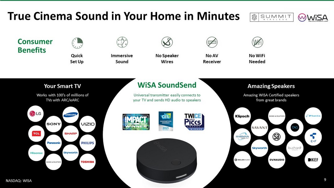 8 NASDAQ: WISA Driving 2021 – 2022 Growth • WiSA Wave • Driving consumer engagement and education • Defining retail category • Lowering marketing costs for brands • 1M visitors projected for 2021 • SoundSend providing universal, low - cost WiSA connectivity • Next - Gen Discovery Wi - Fi technology broadening the market through lower cost Growth Drivers WiSA Wave Launch Q3 2020 SoundSend Launch Q4 2020 Next - Gen Discovery WiFi Module Launch Q1 2021 8