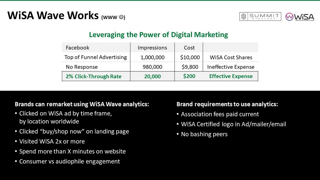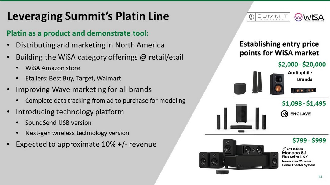 13 NASDAQ: WISA WiSA Wave Works (WWW ) Facebook Impressions Cost Top of Funnel Advertising 1,000,000 $10,000 WiSA Cost Shares No Response 980,000 $9,800 Ineffective Expense 2% Click - Through Rate 20,000 $200 Effective Expense Brands can remarket using WiSA Wave analytics: • Clicked on WiSA ad by time frame, by location worldwide • Clicked “buy/shop now” on landing page • Visited WiSA 2x or more • Spend more than X minutes on website • Consumer vs audiophile engagement Brand requirements to use analytics: • Association fees paid current • WiSA Certified logo in Ad/mailer/email • No bashing peers Leveraging the Power of Digital Marketing
