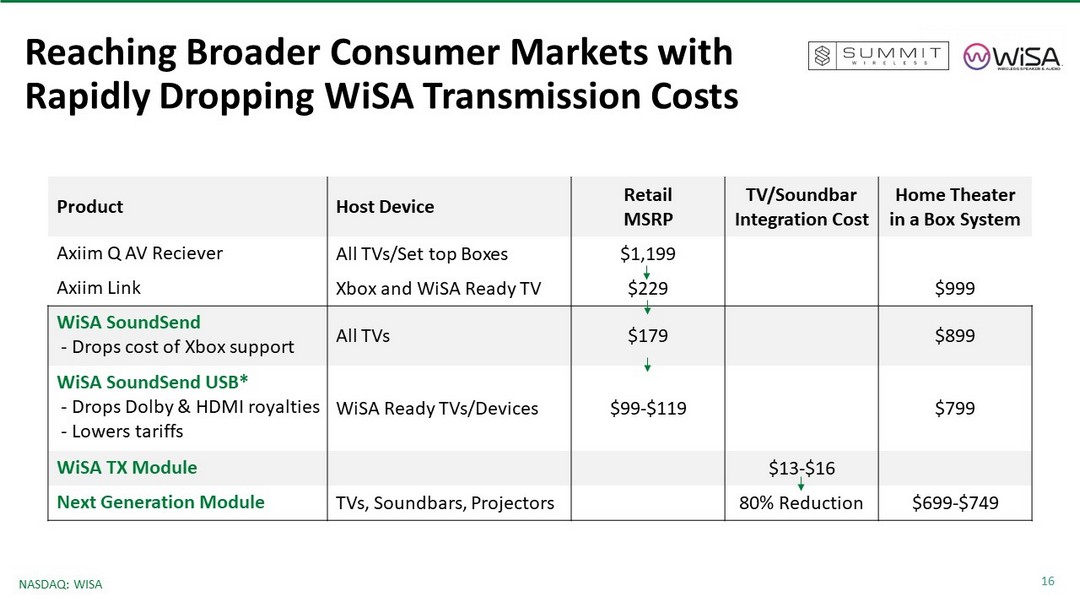 15 NASDAQ: WISA • Immersive Sound Expands to WiFi enabled smart devices: • 1B+ Smart Phones • 200M + Smart TVs • Soundbars and wireless speakers • IoT Devices • 200M Tablets • 60M Gaming PCs and Consoles • 50M Smart Speakers • Technology that can scale • Wi - Fi compliant (2.4GHz) • Wi - Fi compliant (5GHz) • Intuitive, fast out of box setup: ConexUs button • Patent pending Beyond Premium Audio Home Entertainment ConexUs Mobile