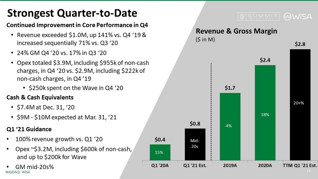 17 NASDAQ: WISA Strongest Quarter - to - Date $0.4 $0.8 $1.7 $2.4 $2.8 Q1 '20A Q1 '21 Est. 2019A 2020A TTM Q1 '21 Est. 18% Revenue & Gross Margin ($ in M) Continued Improvement in Core Performance in Q4 • Revenue exceeded $1.0M, up 141% vs. Q4 ‘19 & increased sequentially 71% vs. Q3 ‘20 • 24% GM Q4 ’20 vs. 17% in Q3 ‘20 • Opex totaled $3.9M, including $955k of non - cash charges, in Q4 ‘20 vs. $2.9M, including $222k of non - cash charges, in Q4 ’19 • $250k spent on the Wave in Q4 ‘20 Cash & Cash Equivalents • $7.4M at Dec. 31, ‘20 • $9M - $10M expected at Mar. 31, ‘21 Q1 ‘21 Guidance • 100% revenue growth vs. Q1 ‘20 • Opex ~$3.2M, including $600k of non - cash, and up to $200k for Wave • GM mid - 20s% 17 20+% - 4% Mid - 20s 15%