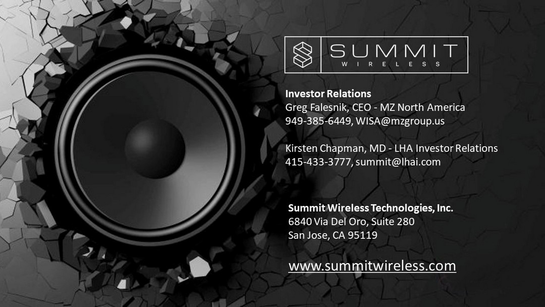 Investor Relations Greg Falesnik, CEO - MZ North America 949 - 385 - 6449, WISA@mzgroup.us Kirsten Chapman, MD - LHA Investor Relations 415 - 433 - 3777, summit@lhai.com Summit Wireless Technologies, Inc. 6840 Via Del Oro, Suite 280 San Jose, CA 95119 www.summitwireless.com