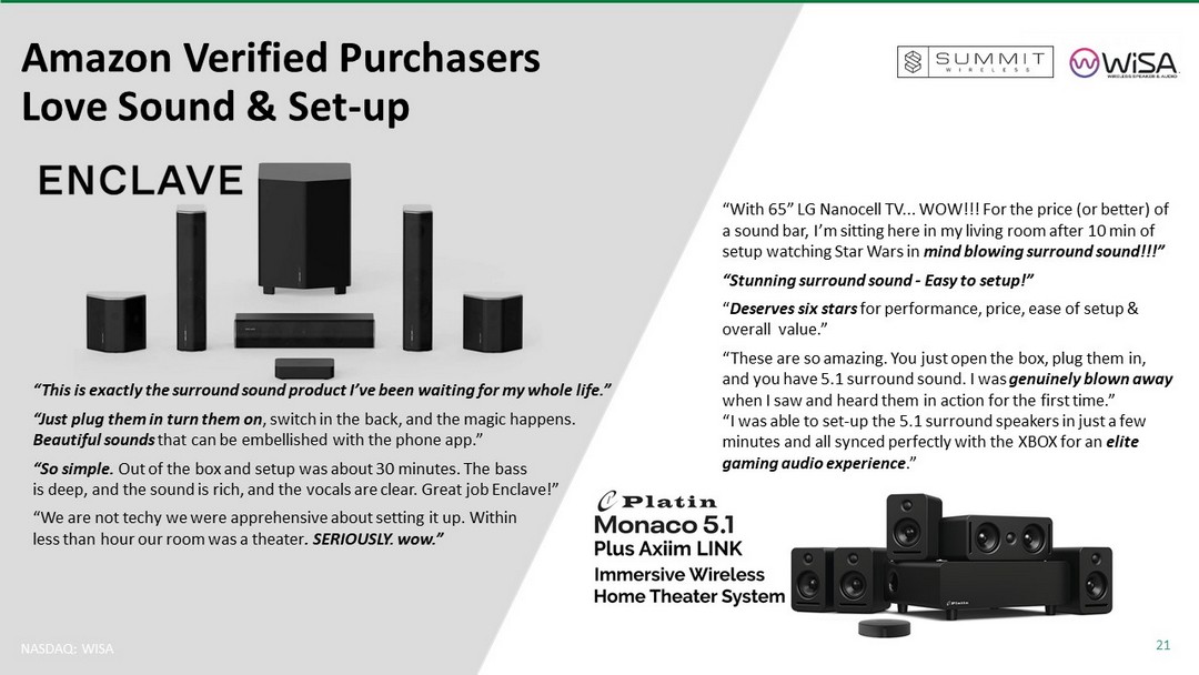 21 NASDAQ: WISA Amazon Verified Purchasers Love Sound & Set - up “With 65” LG Nanocell TV... WOW!!! For the price (or better) of a sound bar, I’m sitting here in my living room after 10 min of setup watching Star Wars in mind blowing surround sound!!!” “Stunning surround sound - Easy to setup!” “ Deserves six stars for performance, price, ease of setup & overall value.” “These are so amazing. You just open the box, plug them in, and you have 5.1 surround sound. I was genuinely blown away when I saw and heard them in action for the first time.” “I was able to set - up the 5.1 surround speakers in just a few minutes and all synced perfectly with the XBOX for an elite gaming audio experience .” “This is exactly the surround sound product I’ve been waiting for my whole life.” “Just plug them in turn them on , switch in the back, and the magic happens. Beautiful sounds that can be embellished with the phone app.” “So simple. Out of the box and setup was about 30 minutes. The bass is deep, and the sound is rich, and the vocals are clear. Great job Enclave!” “We are not techy we were apprehensive about setting it up. Within less than hour our room was a theater . SERIOUSLY. wow.” NASDAQ: WISA