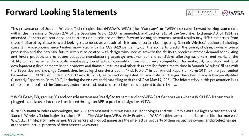 2 NASDAQ: WISA Forward Looking Statements This presentation of Summit Wireless Technologies, Inc . (NASDAQ : WISA) (the “Company” or “WISA”) contains forward - looking statements within the meaning of Section 27 A of the Securities Act of 1933 , as amended, and Section 21 E of the Securities Exchange Act of 1934 , as amended . Readers are cautioned not to place undue reliance on these forward - looking statements . Actual results may differ materially from those indicated by these forward - looking statements as a result of risks and uncertainties impacting Summit Wireless’ business including, current macroeconomic uncertainties associated with the COVID - 19 pandemic, our the ability to predict the timing of design wins entering production and the potential future revenue associated with design wins ; rate of growth ; the ability to predict customer demand for existing and future products and to secure adequate manufacturing capacity ; consumer demand conditions affecting customers’ end markets ; the ability to hire, retain and motivate employees ; the effects of competition, including price competition ; technological, regulatory and legal developments ; developments in the economy and financial markets and other risks detailed from time to time in Summit Wireless’ filings with the Securities and Exchange Commission, including those described in “Risk Factors” in our Annual Report on Form 10 - K for the year ended December 31 , 2020 filed with the SEC March 16 , 2021 , as revised or updated for any material changes described in any subsequently - filed Quarterly Reports on Form 10 - Q, including the one we anticipate filing with the SEC on May 12 , 2021 . The information in this presentation is as of the date hereof and the Company undertakes no obligations to update unless required to do so by law . * WiSA Ready TVs, gaming PCs and console systems are "ready" to transmit audio to WiSA Certified speakers when a WiSA USB Tra nsm itter is plugged in and a user interface is activated through an APP or product design like LG TVs. © 2021 Summit Wireless Technologies, Inc. All rights reserved. Summit Wireless Technologies and the Summit Wireless logo are tra demarks of Summit Wireless Technologies, Inc., SoundSend, The WiSA logo, WiSA, WiSA Ready, and WiSA Certified are trademarks, or certifi cat ion marks of WiSA LLC. Third - party trade names, trademarks and product names are the intellectual property of their respective owners and pro duct names are the intellectual property of their respective owners.