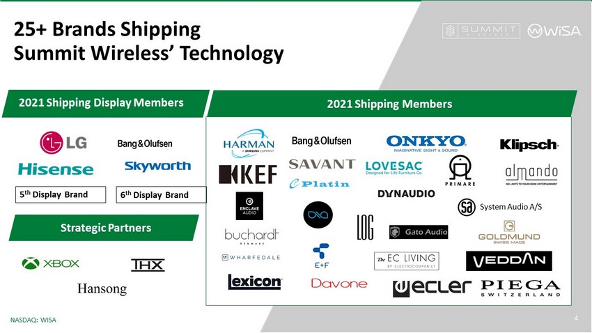 3 NASDAQ: WISA Markets and sells ASICS, modules & IP that is integrated into leading TV & speaker brands Association with 70+ leading CE brands implementing WiSA global interoperability standard Summit Wireless NASDAQ: WISA Summit Wireless Summit Wireless is a leading provider of immersive, wireless sound technology for intelligent devices & next - generation home entertainment systems 3