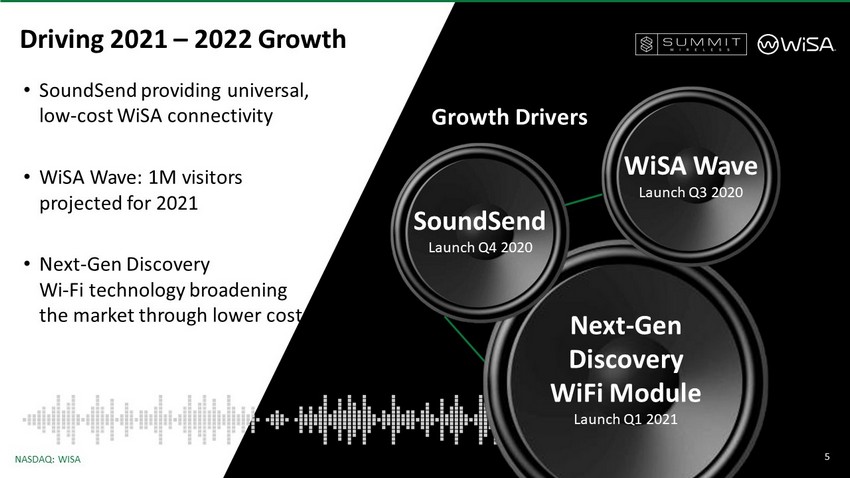 4 NASDAQ: WISA 2021 Shipping Display Members System Audio A/S 2021 Shipping Members 4 5 th Display Brand Strategic Partners 25+ Brands Shipping Summit Wireless’ Technology 6 th Display Brand