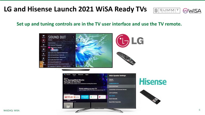 6 NASDAQ: WISA LG and Hisense Launch 2021 WiSA Ready TVs Set up and tuning controls are in the TV user interface and use the TV remote.