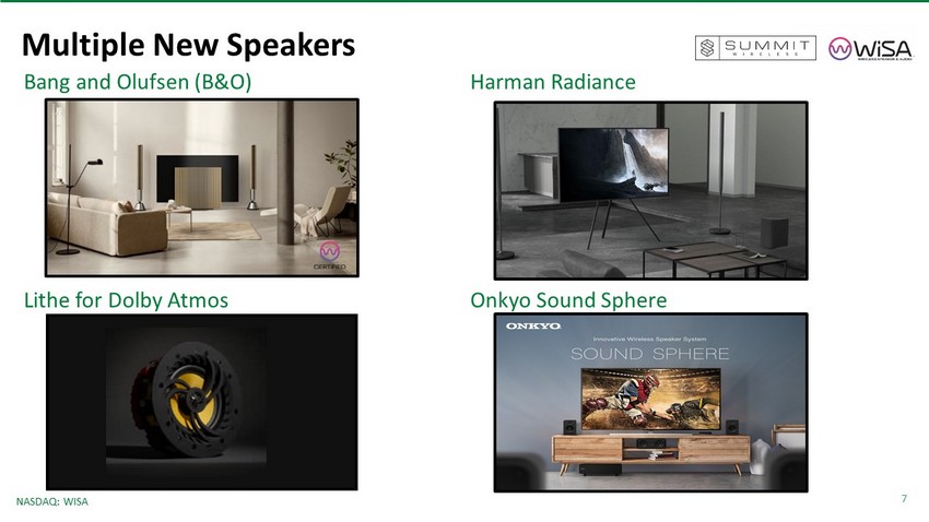 7 NASDAQ: WISA Multiple New Speakers Bang and Olufsen (B&O) Harman Radiance Lithe for Dolby Atmos Onkyo Sound Sphere