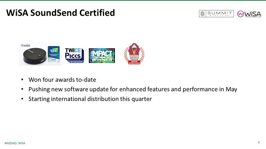 8 NASDAQ: WISA WiSA SoundSend Certified • Won four awards to - date • Pushing new software update for enhanced features and performance in May • Starting international distribution this quarter