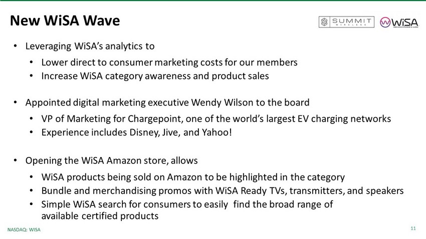 10 NASDAQ: WISA 1,200 2,400 3,400 19,200 34,300 47,000 99,500 185,000 139,000 165,000 250,000 450,000 Q1 '19 A Q2 '19 A Q3 '19 A Q4 '19 A Q1 '20 A Q2 '20 A Q3 '20 A Q4 '20 A Q1 '21 A Q2 '21 E Q3 '21 E Q4 '21 E 1M+ Visitors Projected in 2021 WiSA Wave Launched Sept. ‘20 WiSA Wave Accelerating Web Traffic Over 300% growth in visitors from Q1 2020 to Q1 2021.