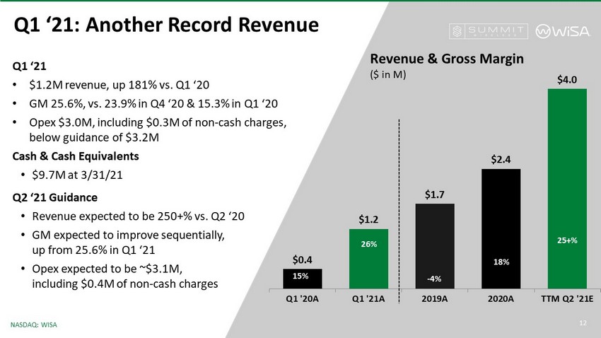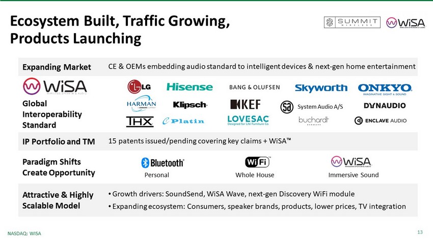 12 NASDAQ: WISA Q1 ‘21: Another Record Revenue $0.4 $1.2 $1.7 $2.4 $4.0 Q1 '20A Q1 '21A 2019A 2020A TTM Q2 '21E 18% Revenue & Gross Margin ($ in M) Q1 ‘21 • $1.2M revenue, up 181% vs. Q1 ‘20 • GM 25.6%, vs. 23.9% in Q4 ‘20 & 15.3% in Q1 ‘20 • Opex $3.0M, including $0.3M of non - cash charges, below guidance of $3.2M Cash & Cash Equivalents • $9.7M at 3/31/21 Q2 ‘21 Guidance • Revenue expected to be 250+% vs. Q2 ‘20 • GM expected to improve sequentially, up from 25.6% in Q1 ‘21 • Opex expected to be ~$3.1M, including $0.4M of non - cash charges 12 25+% - 4% 26% 15%