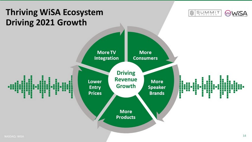 13 NASDAQ: WISA Expanding Market CE & OEMs embedding audio standard to intelligent devices & next - gen home entertainment Global Interoperability Standard IP Portfolio and TM 15 patents issued/pending covering key claims + WiSA 䉼 Paradigm Shifts Create Opportunity Attractive & Highly Scalable Model • Growth drivers: SoundSend, WiSA Wave, next - gen Discovery WiFi module • Expanding ecosystem: Consumers, speaker brands, products, lower prices, TV integration Ecosystem Built, Traffic Growing, Products Launching Personal Whole House Immersive Sound System Audio A/S