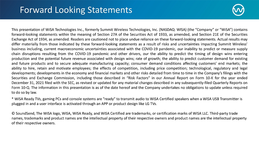 Forward Looking Statements This presentation of WiSA Technologies Inc . , formerly Summit Wireless Technologies, Inc . (NASDAQ : WISA) (the “Company” or “ WiSA ”) contains forward - looking statements within the meaning of Section 27 A of the Securities Act of 1933 , as amended, and Section 21 E of the Securities Exchange Act of 1934 , as amended . Readers are cautioned not to place undue reliance on these forward - looking statements . Actual results may differ materially from those indicated by these forward - looking statements as a result of risks and uncertainties impacting Summit Wireless’ business including, current macroeconomic uncertainties associated with the COVID - 19 pandemic, our inability to predict or measure supply chain disruptions resulting from the COVID - 19 pandemic and other drivers, our the ability to predict the timing of design wins entering production and the potential future revenue associated with design wins ; rate of growth ; the ability to predict customer demand for existing and future products and to secure adequate manufacturing capacity ; consumer demand conditions affecting customers’ end markets ; the ability to hire, retain and motivate employees ; the effects of competition, including price competition ; technological, regulatory and legal developments ; developments in the economy and financial markets and other risks detailed from time to time in the Company’s filings with the Securities and Exchange Commission, including those described in “Risk Factors” in our Annual Report on Form 10 - K for the year ended December 31 , 2021 filed with the SEC, as revised or updated for any material changes described in any subsequently - filed Quarterly Reports on Form 10 - Q . The information in this presentation is as of the date hereof and the Company undertakes no obligations to update unless required to do so by law . * WiSA Ready TVs, gaming PCs and console systems are "ready" to transmit audio to WiSA Certified speakers when a WiSA USB Tra nsm itter is plugged in and a user interface is activated through an APP or product design like LG TVs. © SoundSend , The WiSA logo, WiSA, WiSA Ready, and WiSA Certified are trademarks, or certification marks of WiSA LLC. Third - party trade names, trademarks and product names are the intellectual property of their respective owners and product names are the intell ect ual property of their respective owners.