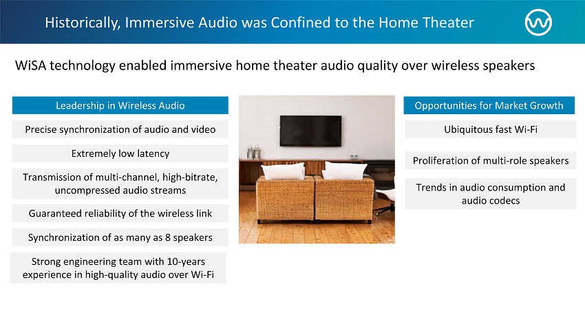 Historically, Immersive Audio was Confined to the Home Theater WiSA technology enabled immersive home theater audio quality over wireless speakers Precise synchronization of audio and video Transmission of multi - channel, high - bitrate, uncompressed audio streams Guaranteed reliability of the wireless link Extremely low latency Synchronization of as many as 8 speakers Ubiquitous fast Wi - Fi Opportunities for Market Growth Strong engineering team with 10 - years experience in high - quality audio over Wi - Fi Leadership in Wireless Audio Proliferation of multi - role speakers Trends in audio consumption and audio codecs