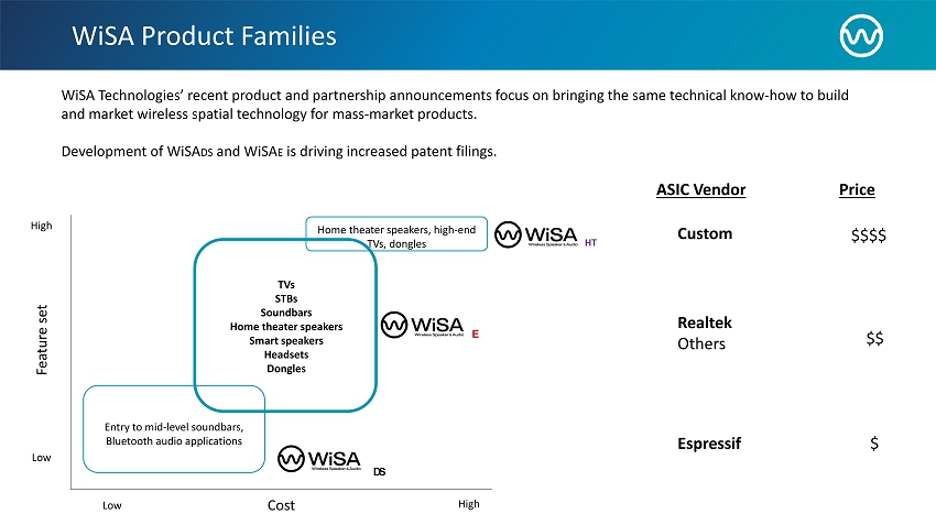 WiSA Product Families WiSA Technologies’ recent product and partnership announcements focus on bringing the same technical know - how to build and market wireless spatial technology for mass - market products. Development of WiSA DS and WiSA E is driving increased patent filings. Cost Feature set Low High Low High WiSA OST Entry - level WiSA GST Mid - market Home theater speakers, high - end TVs, dongles TVs STBs Soundbars Home theater speakers Smart speakers Headsets Dongles Entry to mid - level soundbars, Bluetooth audio applications E HT ASIC Vendor Custom Espressif Realtek Others Price $$$$ $$ $ DS