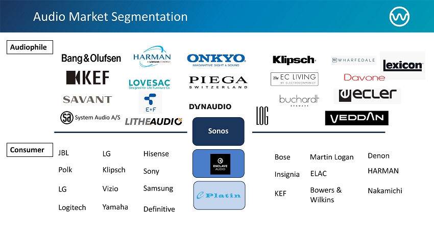 Audio Market Segmentation Sonos Audiophile Consumer System Audio A/S LG Bowers & Wilkins Vizio Sony Hisense Klipsch Polk LG JBL Bose Definitive Logitech Yamaha Samsung KEF ELAC Insignia Martin Logan Nakamichi HARMAN Denon