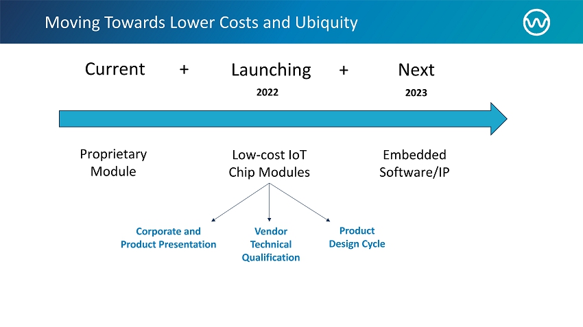 Moving Towards Lower Costs and Ubiquity Proprietary Module Low - cost IoT Chip Modules Embedded Software/IP Current Launching Next + + 2022 2023 Corporate and Product Presentation Vendor Technical Qualification Product Design Cycle