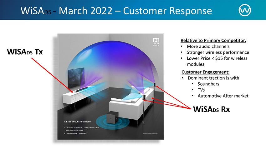 WiSA DS - March 2022 – Customer Response Summit Wireless Proprietary WiSA DS Rx WiSA DS Tx Relative to Primary Competitor: • More audio channels • Stronger wireless performance • Lower Price < $15 for wireless modules Customer Engagement: • Dominant traction is with: • Soundbars • TVs • Automotive After market