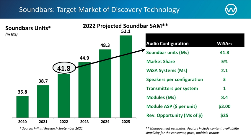 35.8 38.7 41.8 44.9 48.3 52.1 2020 2021 2022 2023 2024 2025 Soundbars Units * (in Ms ) Soundbars: Target Market of Discovery Technology 2022 Projected Soundbar SAM** ** Management estimates: Factors include content availability, simplicity for the consumer, price, multiple brands Audio Configuration WiSA DS Soundbar units (Ms) 41.8 Market Share 5% WiSA Systems (Ms) 2.1 Speakers per configuration 3 Transmitters per system 1 Modules (Ms) 8.4 Module ASP ($ per unit) $3.00 Rev. Opportunity (Ms of $) $25 * Source: Infiniti Research September 2021