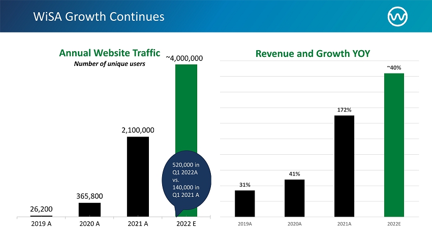 WiSA Growth Continues Revenue and Growth YOY 26,200 365,800 2,100,000 ~ 4,000,000 2019 A 2020 A 2021 A 2022 E Annual Website Traffic Number of unique users 520,000 in Q1 2022A vs. 140,000 in Q1 2021 A 31% 41% 172% ~40% 2019A 2020A 2021A 2022E