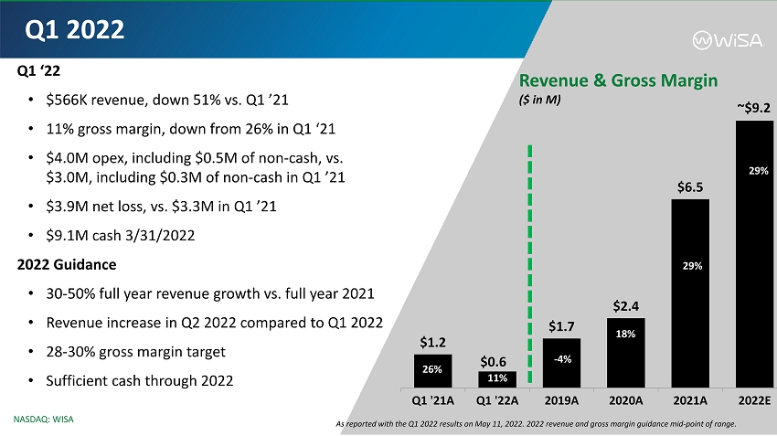 13 NASDAQ: WISA Q1 2022 $1.2 $0.6 $1.7 $2.4 $6.5 Q1 '21A Q1 '22A 2019A 2020A 2021A 2022E 18% 29% 29% Revenue & Gross Margin ($ in M) Q1 ‘22 • $ 566K revenue, down 51% vs. Q1 ’21 • 11 % gross margin, down from 26% in Q1 ‘21 • $ 4.0 M opex , including $0.5M of non - cash, vs. $3.0M, including $0.3M of non - cash in Q1 ’21 • $3.9M net loss, vs. $3.3M in Q1 ’21 • $ 9 .1M cash 3 /31/2022 2022 Guidance • 30 - 50% full year revenue growth vs. full year 2021 • Revenue increase in Q2 2022 compared to Q1 2022 • 28 - 30% gross margin target • Sufficient cash through 2022 - 4% 26 % ~$9.2 As reported with the Q1 2022 results on May 11, 2022. 2022 revenue and gross margin guidance mid - point of range. 11 %