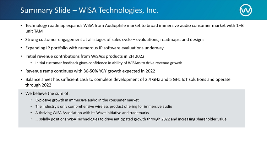 Summary Slide – WiSA Technologies, Inc. • Technology roadmap expands WiSA from Audiophile market to broad immersive audio consumer market with 1+B unit TAM • Strong customer engagement at all stages of sales cycle – evaluations, roadmaps, and designs • Expanding IP portfolio with numerous IP software evaluations underway • Initial revenue contributions from WiSA DS products in 2H 2022 • Initial customer feedback gives confidence in ability of WiSA DS to drive revenue growth • Revenue ramp continues with 30 - 50% YOY growth expected in 2022 • Balance sheet has sufficient cash to complete development of 2.4 GHz and 5 GHz IoT solutions and operate through 2022 • We believe the sum of: • Explosive growth in immersive audio in the consumer market • The industry’s only comprehensive wireless product offering for immersive audio • A thriving WiSA Association with its Wave initiative and trademarks • … solidly positions WiSA Technologies to drive anticipated growth through 2022 and increasing shareholder value