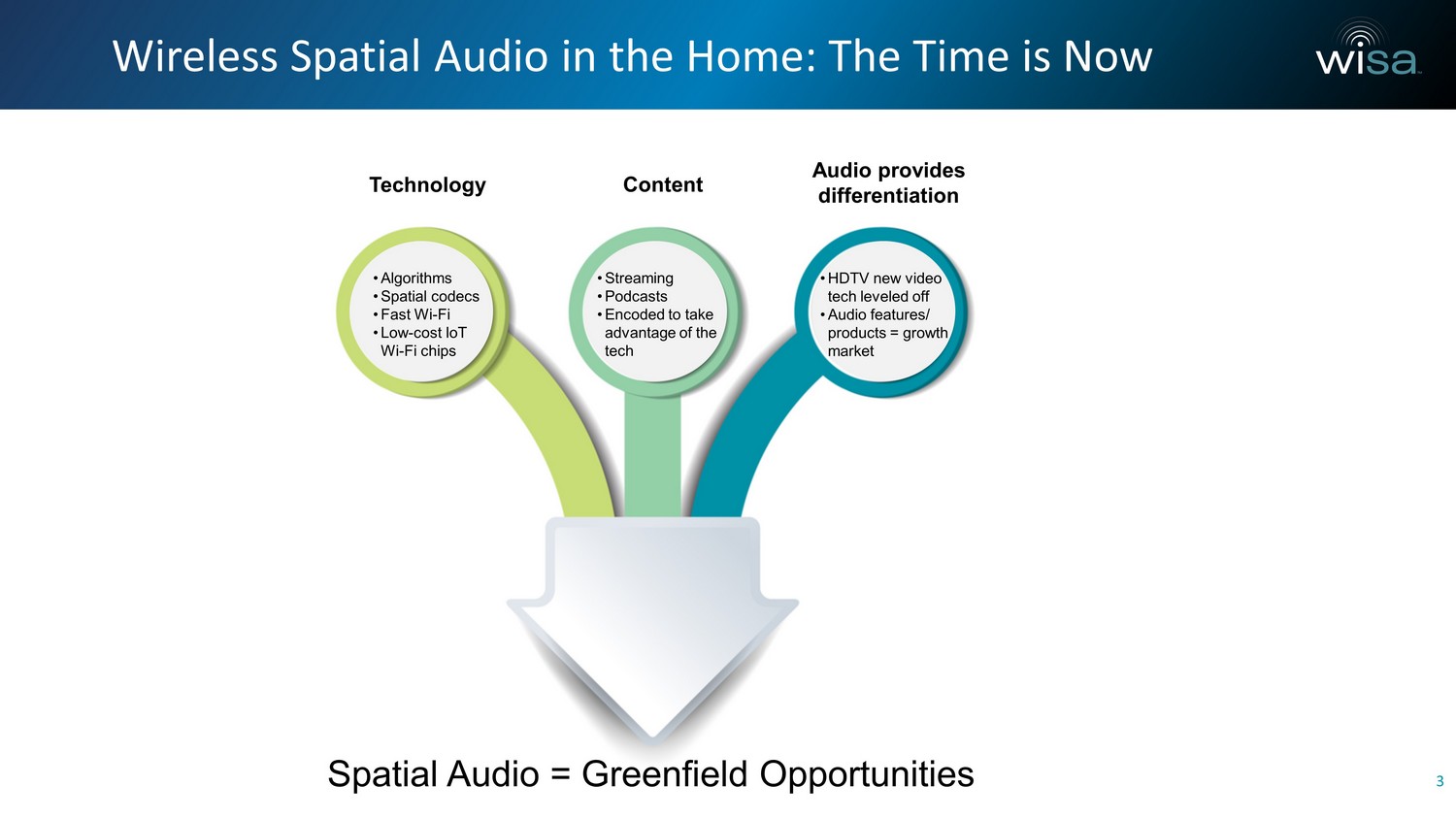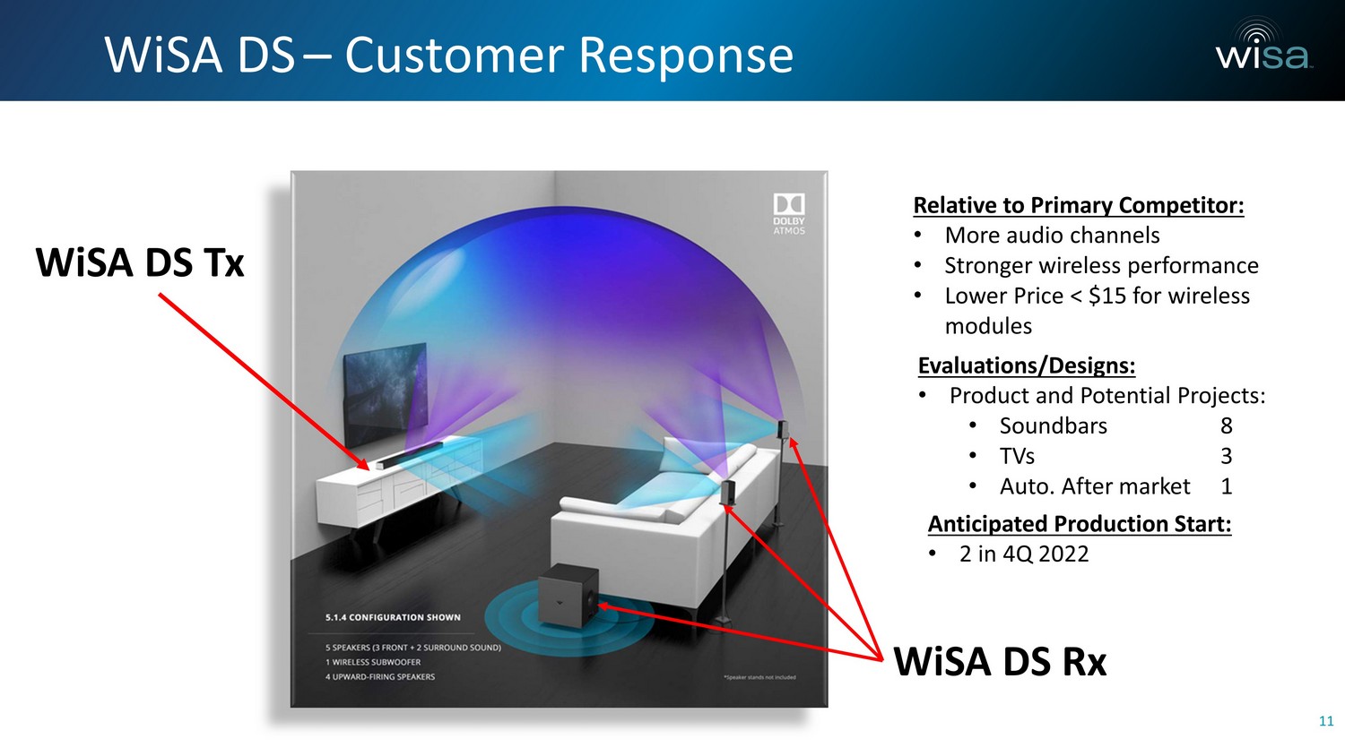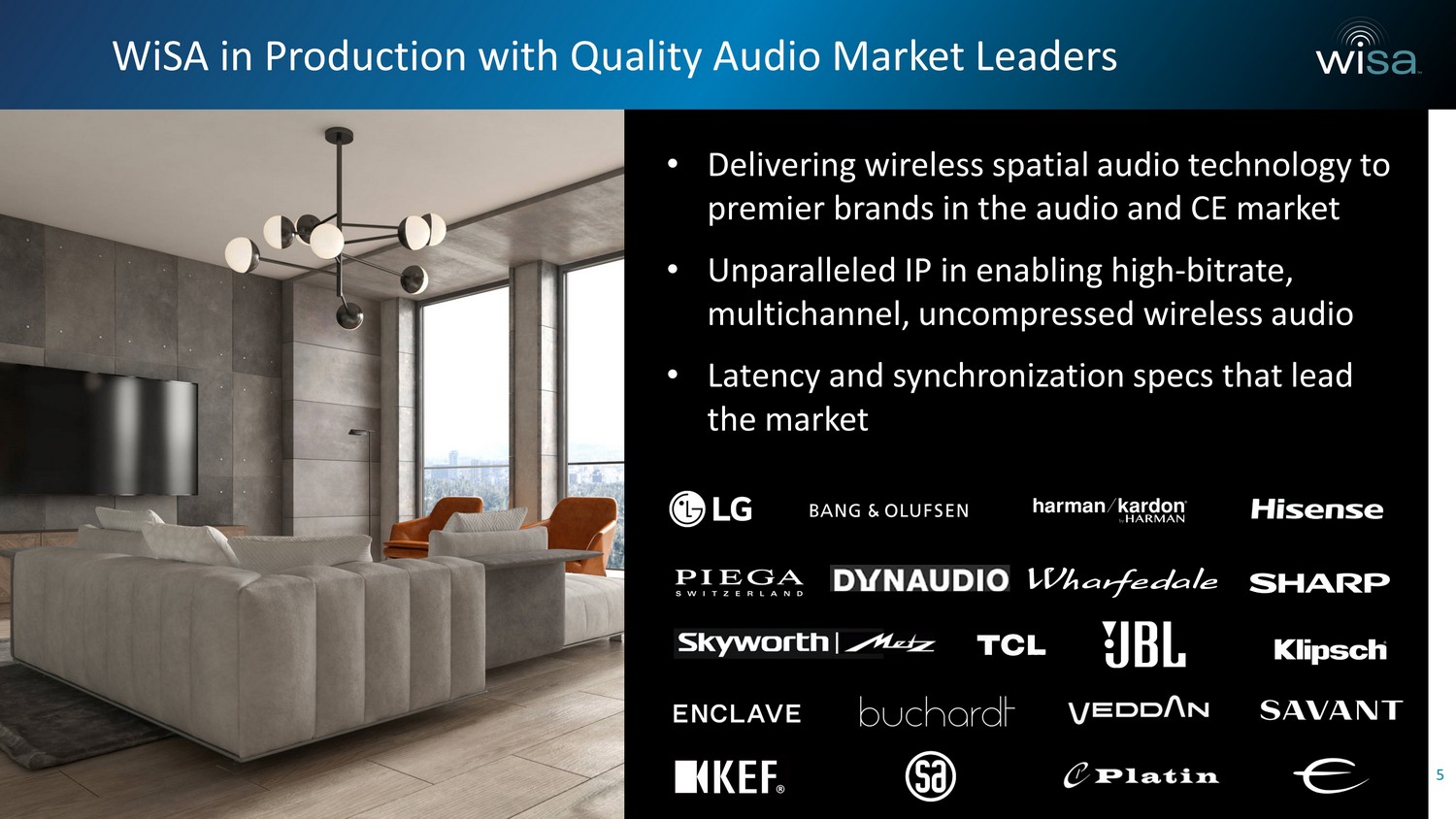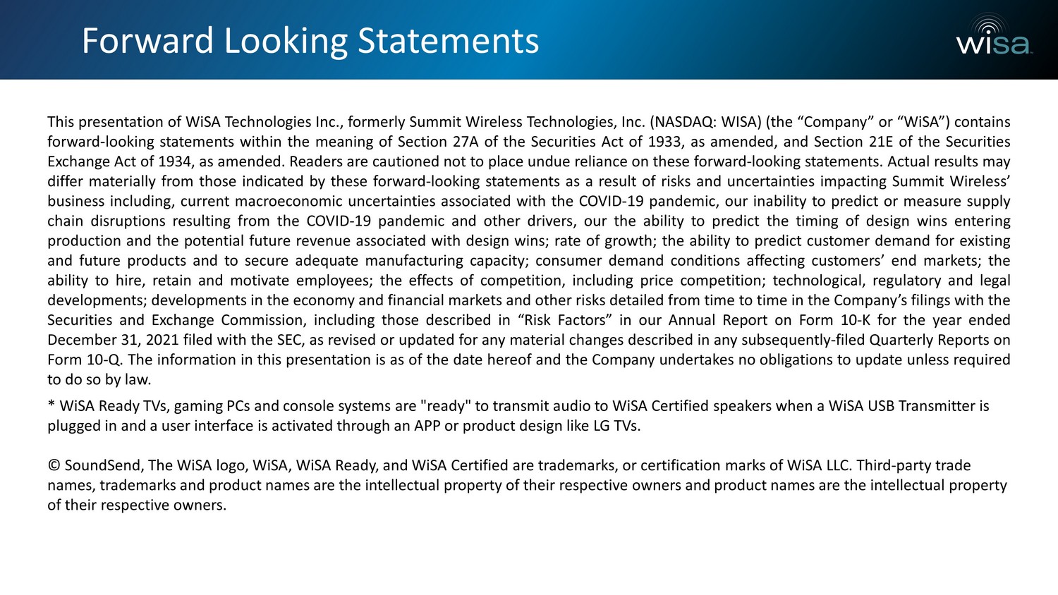 Forward Looking Statements This presentation of WiSA Technologies Inc . , formerly Summit Wireless Technologies, Inc . (NASDAQ : WISA) (the “Company” or “ WiSA ”) contains forward - looking statements within the meaning of Section 27 A of the Securities Act of 1933 , as amended, and Section 21 E of the Securities Exchange Act of 1934 , as amended . Readers are cautioned not to place undue reliance on these forward - looking statements . Actual results may differ materially from those indicated by these forward - looking statements as a result of risks and uncertainties impacting Summit Wireless’ business including, current macroeconomic uncertainties associated with the COVID - 19 pandemic, our inability to predict or measure supply chain disruptions resulting from the COVID - 19 pandemic and other drivers, our the ability to predict the timing of design wins entering production and the potential future revenue associated with design wins ; rate of growth ; the ability to predict customer demand for existing and future products and to secure adequate manufacturing capacity ; consumer demand conditions affecting customers’ end markets ; the ability to hire, retain and motivate employees ; the effects of competition, including price competition ; technological, regulatory and legal developments ; developments in the economy and financial markets and other risks detailed from time to time in the Company’s filings with the Securities and Exchange Commission, including those described in “Risk Factors” in our Annual Report on Form 10 - K for the year ended December 31 , 2021 filed with the SEC, as revised or updated for any material changes described in any subsequently - filed Quarterly Reports on Form 10 - Q . The information in this presentation is as of the date hereof and the Company undertakes no obligations to update unless required to do so by law . * WiSA Ready TVs, gaming PCs and console systems are "ready" to transmit audio to WiSA Certified speakers when a WiSA USB Tra nsm itter is plugged in and a user interface is activated through an APP or product design like LG TVs. © SoundSend , The WiSA logo, WiSA, WiSA Ready, and WiSA Certified are trademarks, or certification marks of WiSA LLC. Third - party trade names, trademarks and product names are the intellectual property of their respective owners and product names are the intell ect ual property of their respective owners.