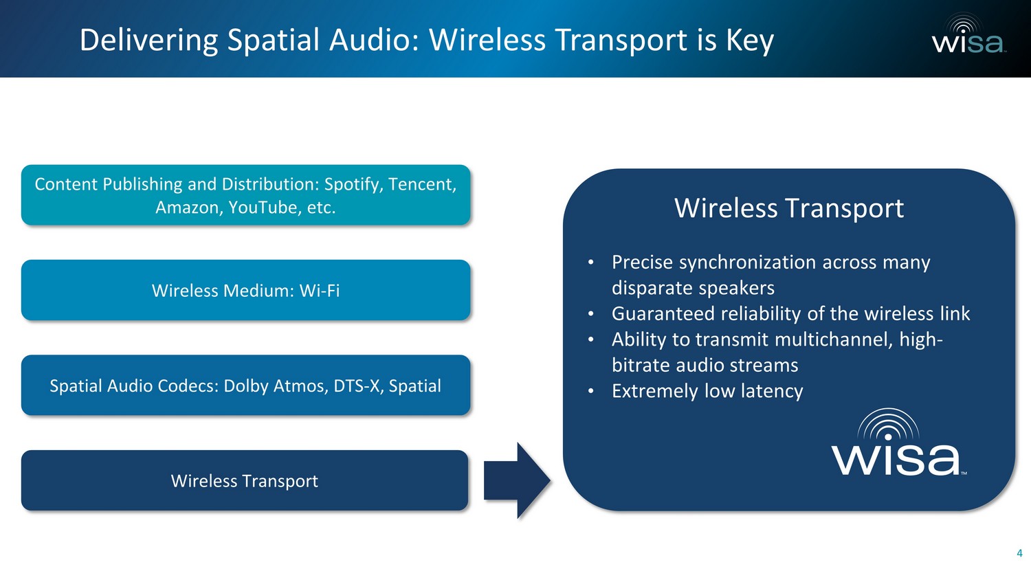Wireless Spatial Audio in the Home: The Time is Now Spatial Audio = Greenfield O pportunities Technology Content Audio provides differentiation • Algorithms • Spatial codecs • Fast Wi - Fi • Low - cost IoT Wi - Fi chips • Streaming • Podcasts • Encoded to take advantage of the tech • HDTV new video tech leveled off • Audio features/ products = growth market 3